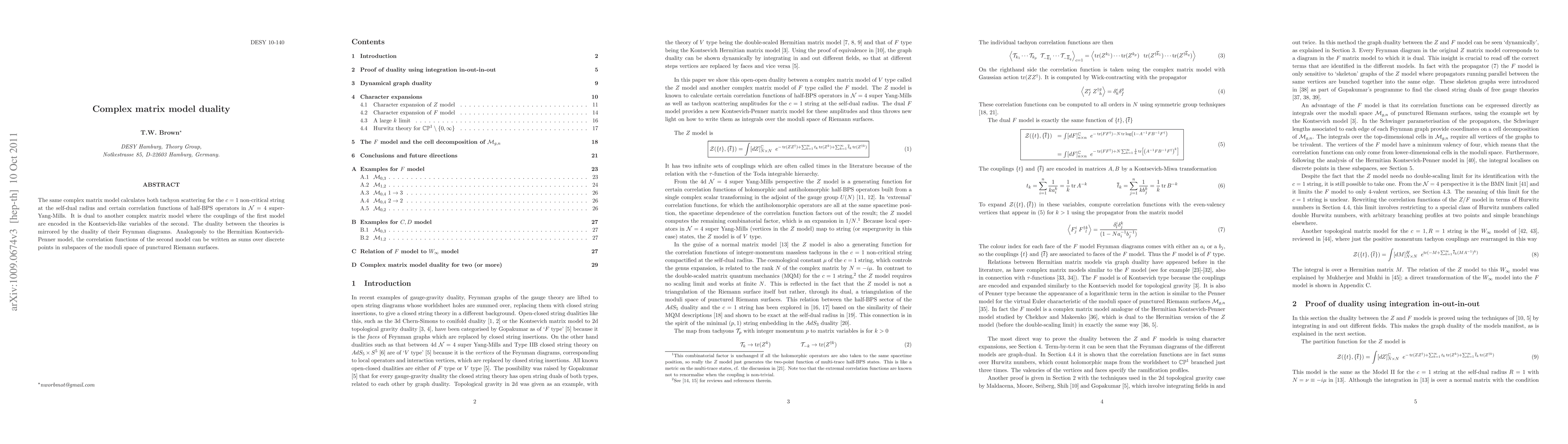 The same complex matrix model calculates both tachyon scattering for the c=1 non-critical string at the self-dual radius and certain correlation functions of half-BPS operators in N=4 super-Yang-Mills. It is dual to another complex matrix model where the couplings of the first model are encoded in the Kontsevich-like variables of the second. The duality between the theories is mirrored by the duality of their Feynman diagrams. Analogously to the Hermitian Kontsevich-Penner model, the correlation functions of the second model can be written as sums over discrete points in subspaces of the moduli space of punctured Riemann surfaces.