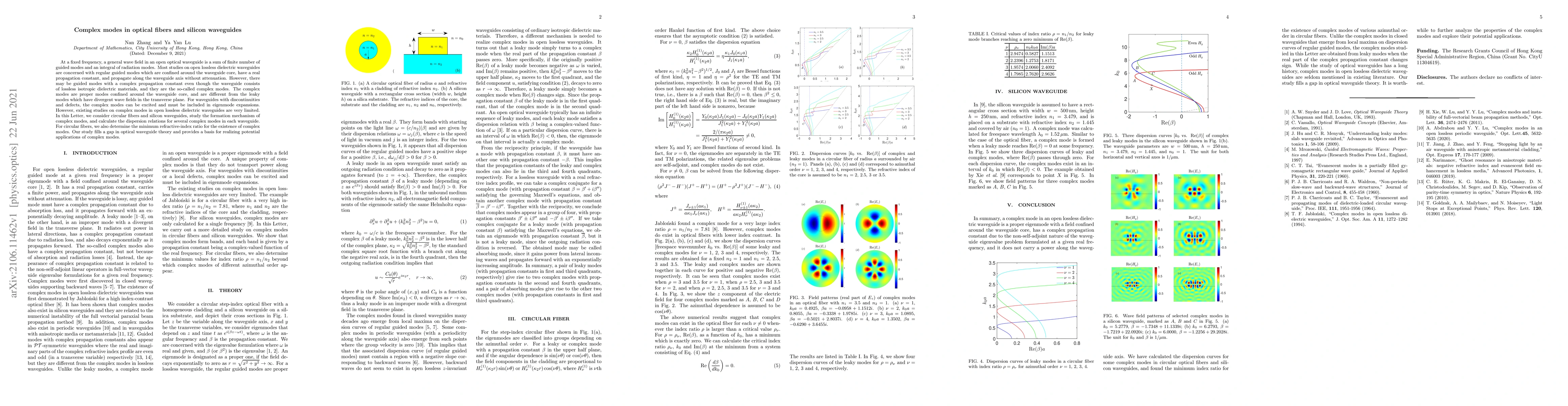 This paper investigates the existence and dispersion relations of complex modes in optical fibers and silicon waveguides, revealing that these modes can exist in lossless dielectric waveguides despite having complex propagation constants. The study provides a theoretical foundation for the potential applications of these complex modes.
