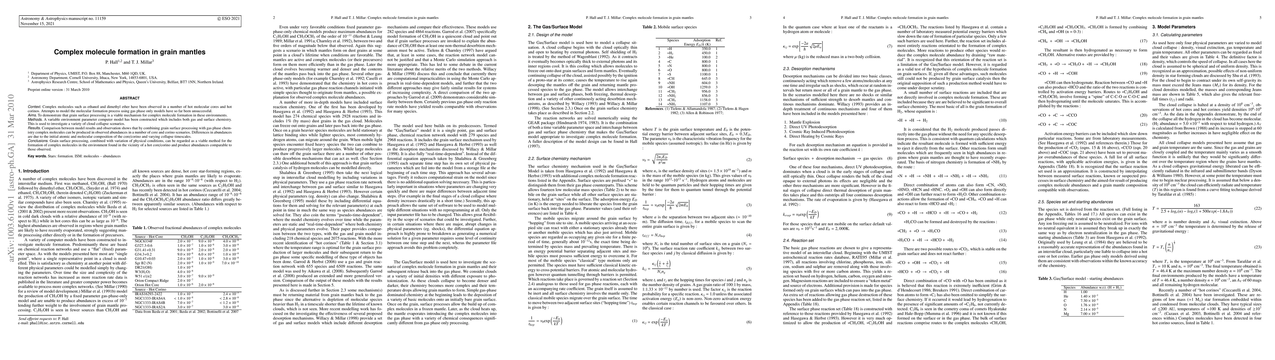 Context: Complex molecules such as ethanol and dimethyl ether have been observed in a number of hot molecular cores and hot corinos. Attempts to model the molecular formation process using gas phase only models have so far been unsuccessful. Aims : To demonstrate that grain surface processing is a viable mechanism for complex molecule formation in these environments. Methods: A variable environment parameter computer model has been constructed which includes both gas and surface chemistry. This is used to investigate a variety of cloud collapse scenarios. Results: Comparison between model results and observation shows that by combining grain surface processing with gas phase chemistry complex molecules can be produced in observed abundances in a number of core and corino scenarios. Differences in abundances are due to the initial atomic and molecular composition of the core/corino and varying collapse timescales. Conclusions: Grain surface processing, combined with variation of physical conditions, can be regarded as a viable method for the formation of complex molecules in the environment found in the vicinity of a hot core/corino and produce abundances comparable to those observed.