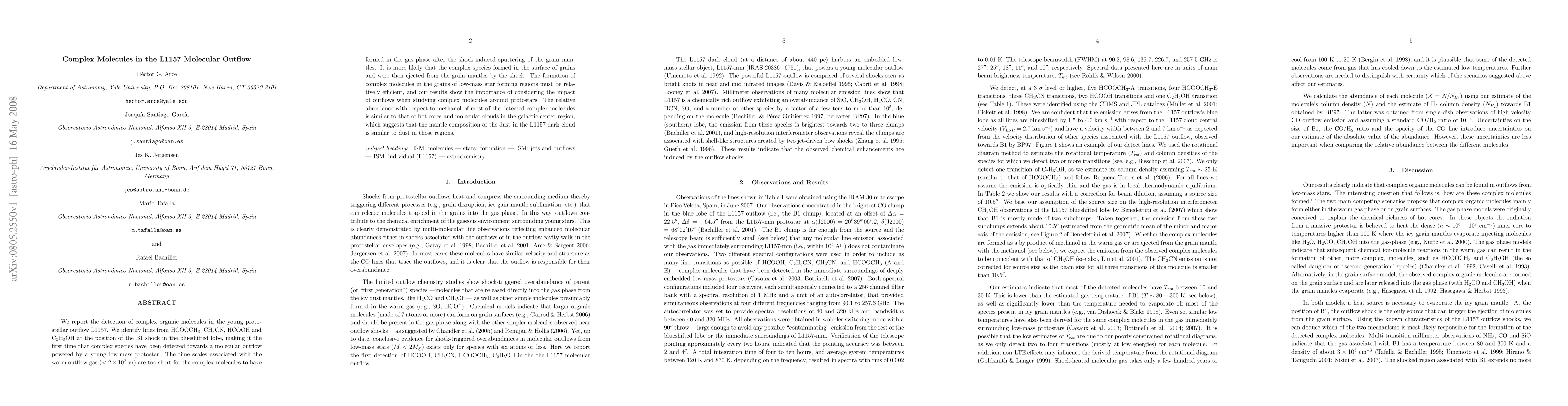 This study detects complex organic molecules like HCOOCH3, CH3CN, HCOOH, and C2H5OH in the L1157 protostellar outflow, indicating their formation on grain surfaces rather than in the gas phase. The findings highlight the efficiency of complex molecule formation in low-mass star-forming regions and the influence of outflows on these processes.