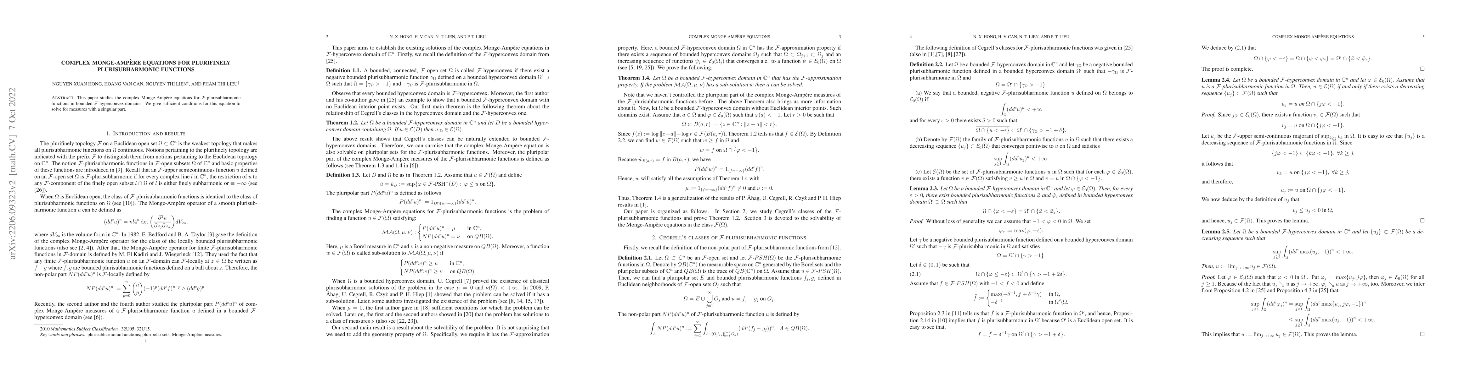 This paper investigates complex Monge-Ampère equations for $\mathcal{F}$-plurisubharmonic functions in $\mathcal{F}$-hyperconvex domains, providing conditions for the equation to yield measures with singular parts.