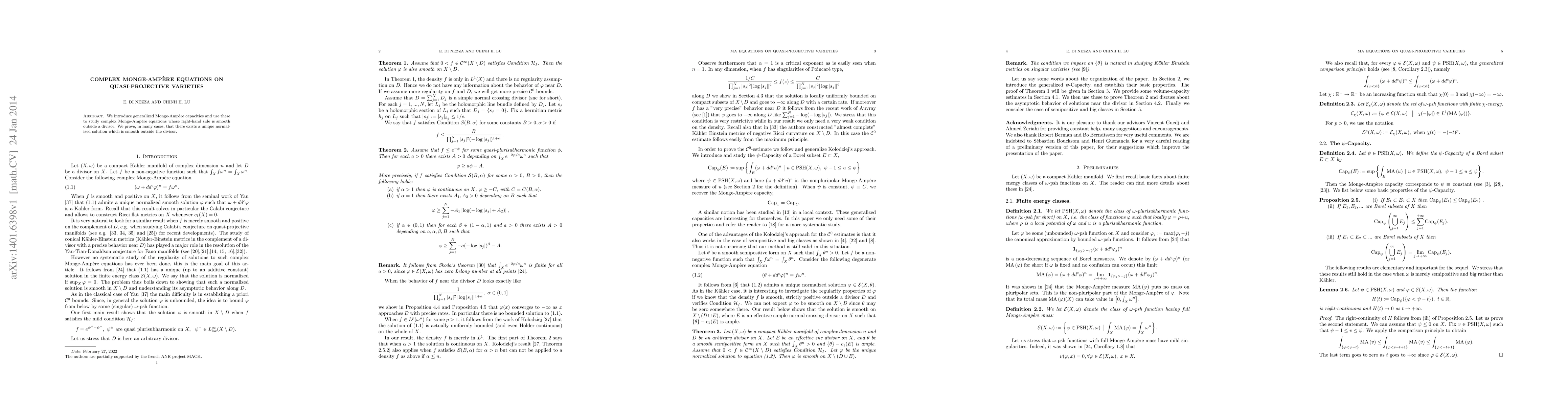 This paper introduces generalized Monge-Ampère capacities to study complex Monge-Ampère equations on quasi-projective varieties, proving the existence and uniqueness of a smooth normalized solution outside a specified divisor.