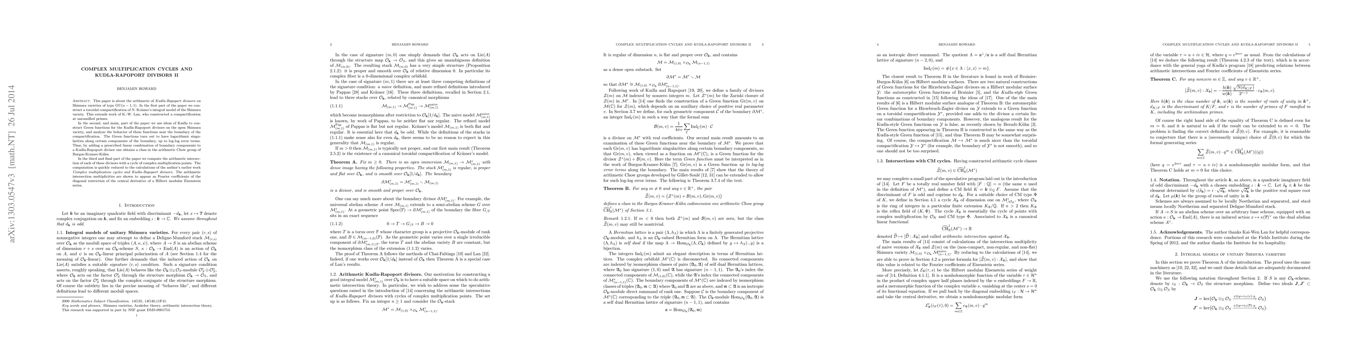 This paper is about the arithmetic of Kudla-Rapoport divisors on Shimura varieties of type GU(n-1,1). In the first part of the paper we construct a toroidal compactification of N. Kramer's integral model of the Shimura variety. This extends work of K.-W. Lan, who constructed a compactification at unramified primes. In the second, and main, part of the paper we use ideas of Kudla to construct Green functions for the Kudla-Rapoport divisors on the open Shimura variety, and analyze the behavior of these functions near the boundary of the compactification. The Green functions turn out to have logarithmic singularities along certain components of the boundary, up to log-log error terms. Thus, by adding a prescribed linear combination of boundary components to a Kudla-Rapoport divisor one obtains a class in the arithmetic Chow group of Burgos-Kramer-Kuhn. In the third and final part of the paper we compute the arithmetic intersection of each of these divisors with a cycle of complex multiplication points. The computation is quickly reduced to the calculations of the author's earlier work Complex multiplication cycles and Kudla-Rapoport divisors. The arithmetic intersection multiplicities are shown to appear as Fourier coefficients of the diagonal restriction of the central derivative of a Hilbert modular Eisenstein series.