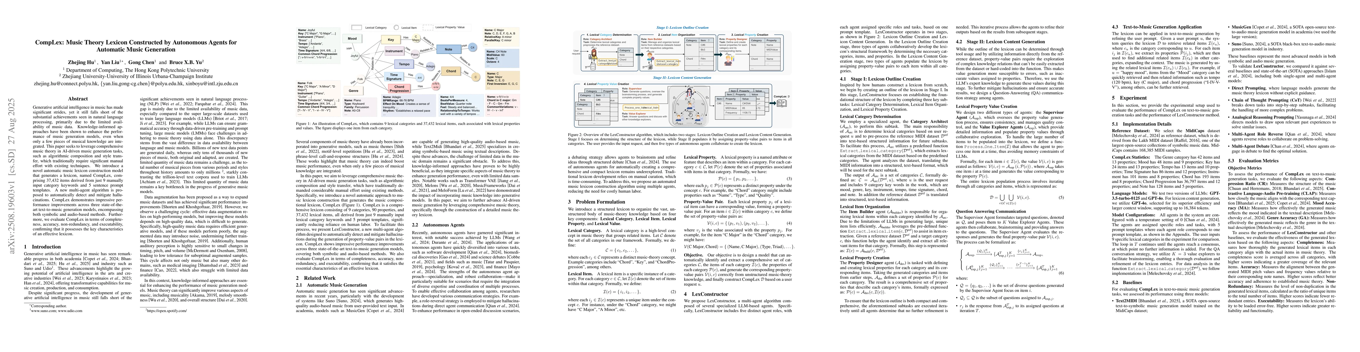Generative artificial intelligence in music has made significant strides, yet it still falls short of the substantial achievements seen in natural language processing, primarily due to the limited availability of music data. Knowledge-informed approaches have been shown to enhance the performance of music generation models, even when only a few pieces of musical knowledge are integrated. This paper seeks to leverage comprehensive music theory in AI-driven music generation tasks, such as algorithmic composition and style transfer, which traditionally require significant manual effort with existing techniques. We introduce a novel automatic music lexicon construction model that generates a lexicon, named CompLex, comprising 37,432 items derived from just 9 manually input category keywords and 5 sentence prompt templates. A new multi-agent algorithm is proposed to automatically detect and mitigate hallucinations. CompLex demonstrates impressive performance improvements across three state-of-the-art text-to-music generation models, encompassing both symbolic and audio-based methods. Furthermore, we evaluate CompLex in terms of completeness, accuracy, non-redundancy, and executability, confirming that it possesses the key characteristics of an effective lexicon.