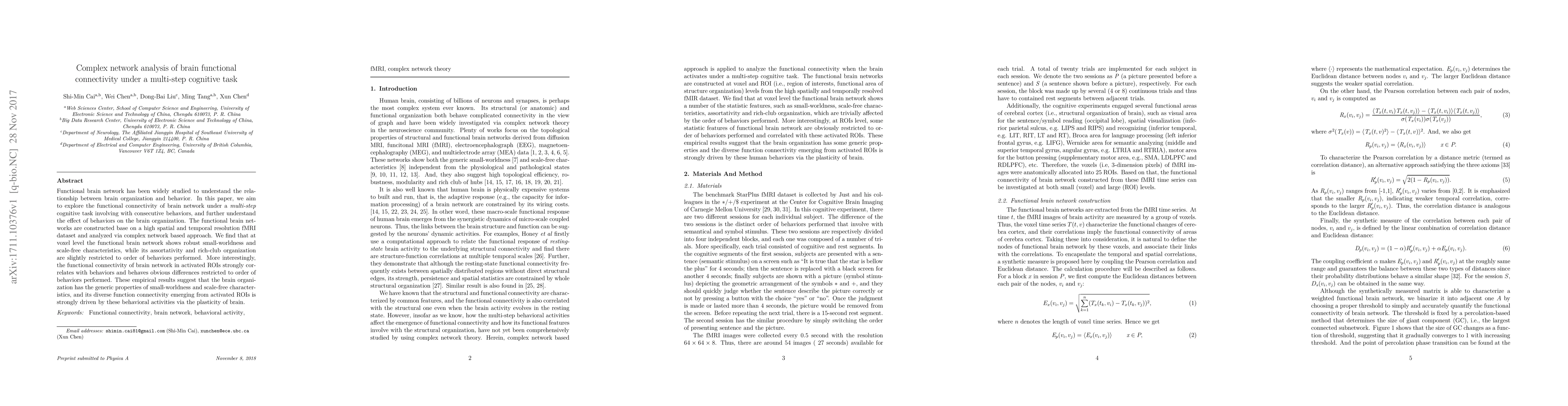 This paper investigates the functional connectivity of brain networks during a multi-step cognitive task using fMRI data and complex network analysis. It finds robust small-world and scale-free characteristics at the voxel level, with connectivity in activated regions correlating strongly with task behaviors, indicating brain plasticity driven by cognitive activities.