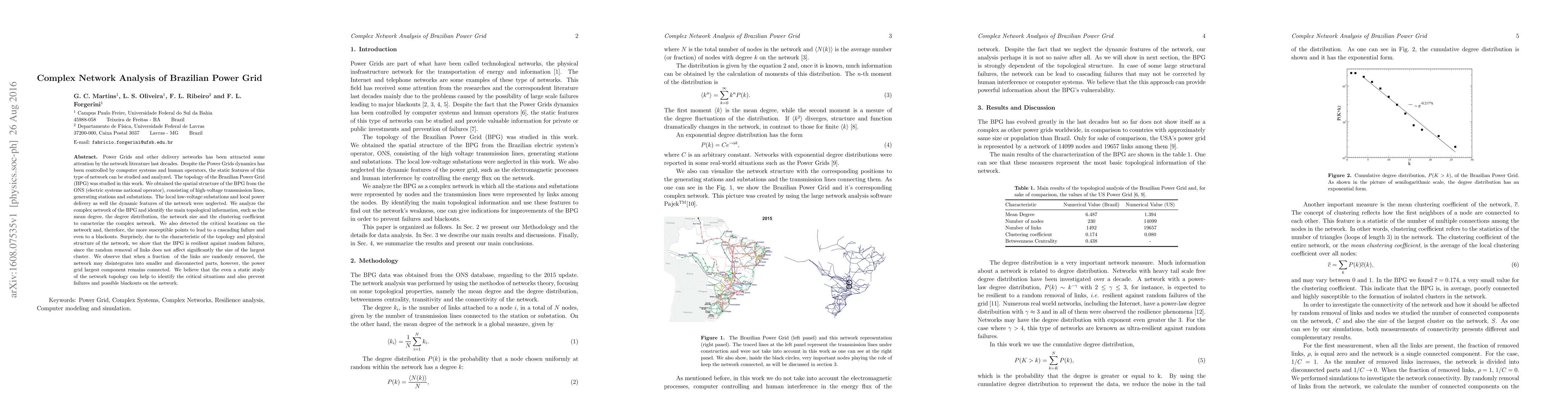 The Brazilian Power Grid was analyzed for its complex network topology, revealing key characteristics such as resilience against random failures and critical locations vulnerable to cascading failure.