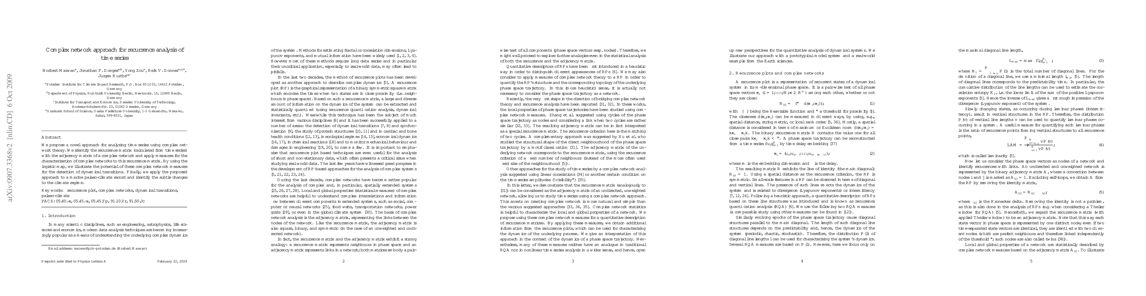 This paper introduces a complex network theory approach to analyze time series by mapping recurrence matrices to network adjacency matrices, demonstrating its effectiveness in detecting dynamical transitions and identifying subtle climate regime changes in a marine palaeo-climate record.