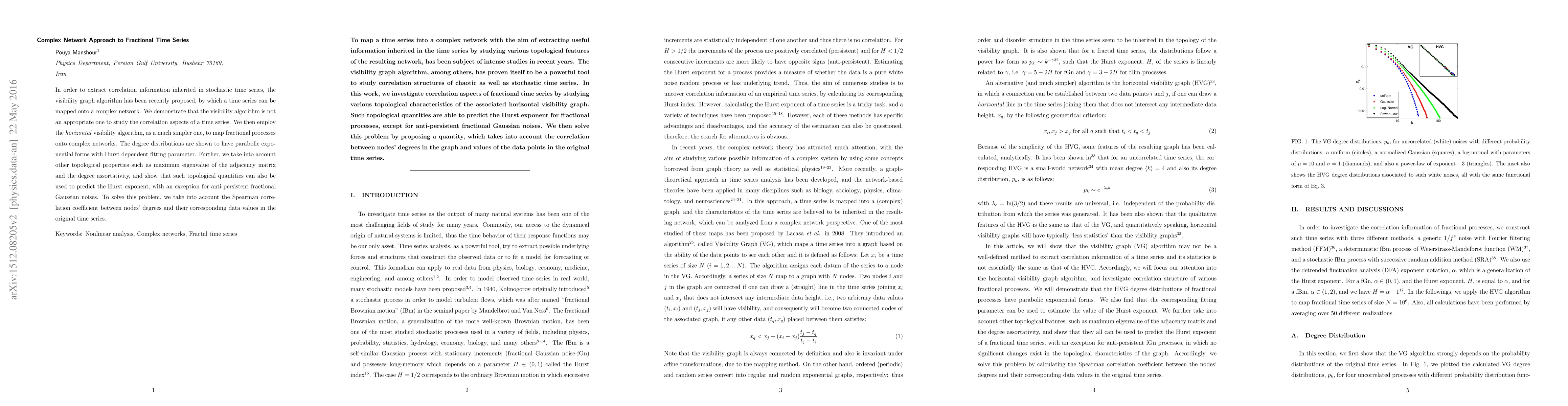 In order to extract correlation information inherited in stochastic time series, the visibility graph algorithm has been recently proposed, by which a time series can be mapped onto a complex network. We demonstrate that the visibility algorithm is not an appropriate one to study the correlation aspects of a time series. We then employ the horizontal visibility algorithm, as a much simpler one, to map fractional processes onto complex networks. The degree distributions are shown to have parabolic exponential forms with Hurst dependent fitting parameter. Further, we take into account other topological properties such as maximum eigenvalue of the adjacency matrix and the degree assortativity, and show that such topological quantities can also be used to predict the Hurst exponent, with an exception for anti-persistent fractional Gaussian noises. To solve this problem, we take into account the Spearman correlation coefficient between nodes' degrees and their corresponding data values in the original time series.