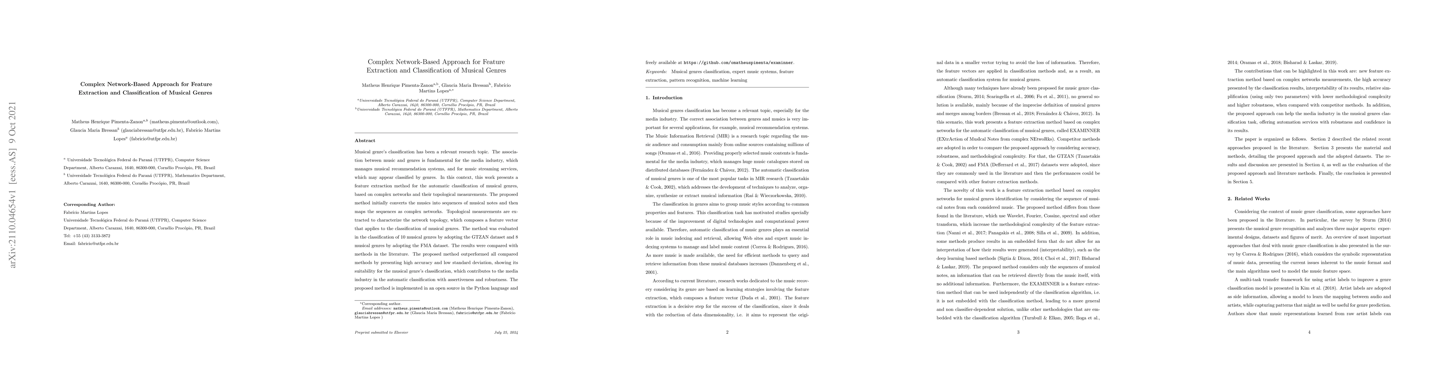 This research introduces a novel method for automatic musical genre classification using complex networks. By converting music into note sequences and mapping them as networks, the method extracts topological measurements to characterize genre-specific network topologies. Evaluated on GTZAN and FMA datasets, the approach outperformed existing methods, demonstrating high accuracy and robustness for industry applications like recommendation systems and music streaming services.