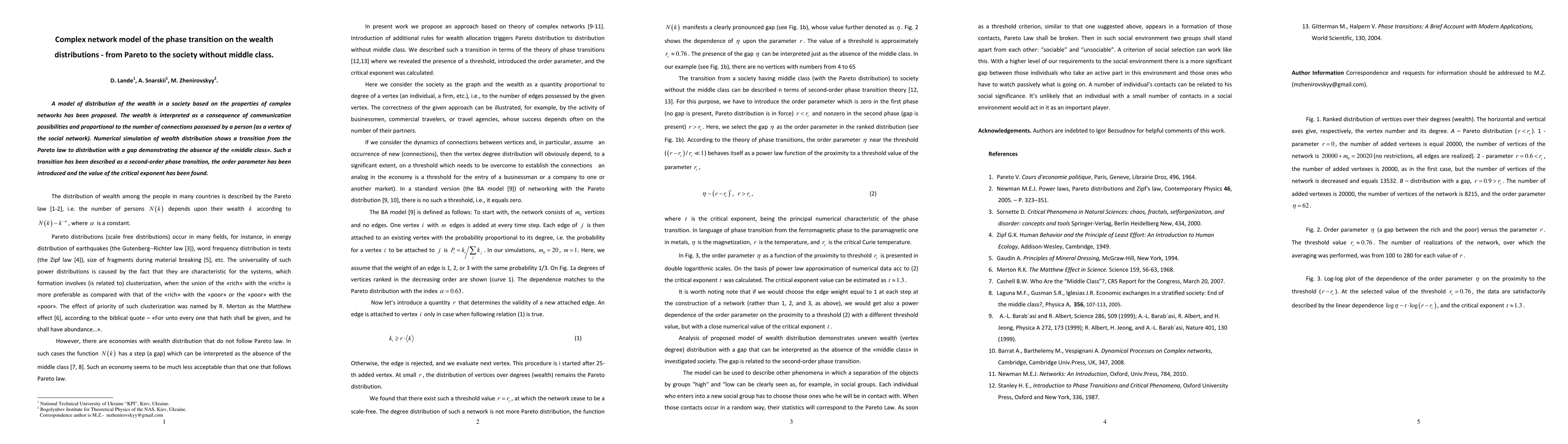 A model of distribution of the wealth in a society based on the properties of complex networks has been proposed. The wealth is interpreted as a consequence of communication possibilities and proportional to the number of connections possessed by a person (as a vertex of the social network). Numerical simulation of wealth distribution shows a transition from the Pareto law to distribution with a gap demonstrating the absence of the middle class. Such a transition has been described as a second-order phase transition, the order parameter has been introduced and the value of the critical exponent has been found.