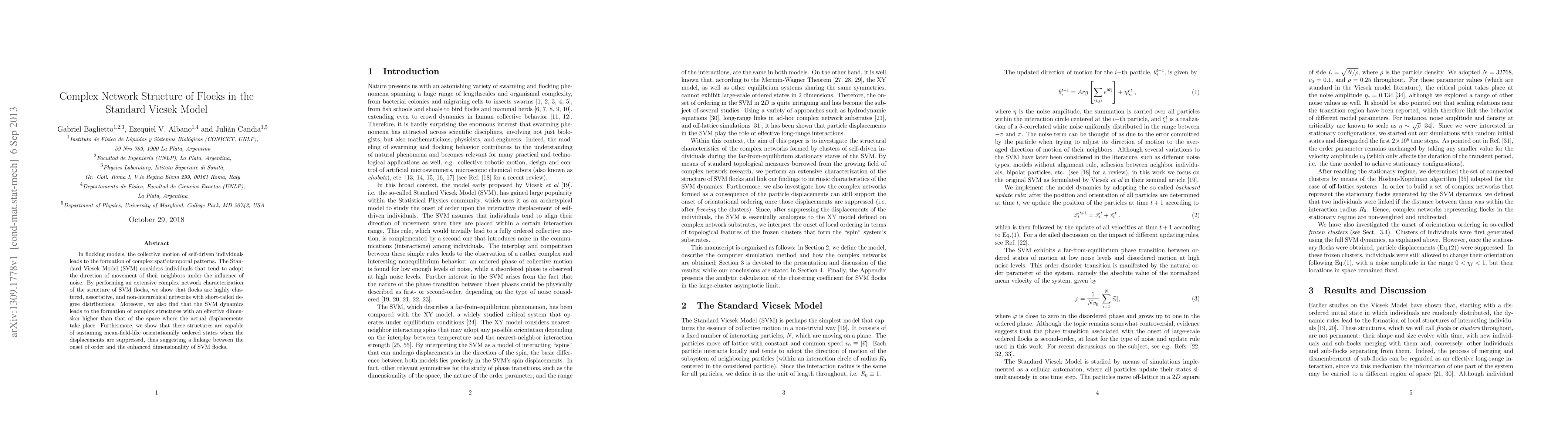 In flocking models, the collective motion of self-driven individuals leads to the formation of complex spatiotemporal patterns. The Standard Vicsek Model (SVM) considers individuals that tend to adopt the direction of movement of their neighbors under the influence of noise. By performing an extensive complex network characterization of the structure of SVM flocks, we show that flocks are highly clustered, assortative, and non-hierarchical networks with short-tailed degree distributions. Moreover, we also find that the SVM dynamics leads to the formation of complex structures with an effective dimension higher than that of the space where the actual displacements take place. Furthermore, we show that these structures are capable of sustaining mean-field-like orientationally ordered states when the displacements are suppressed, thus suggesting a linkage between the onset of order and the enhanced dimensionality of SVM flocks.