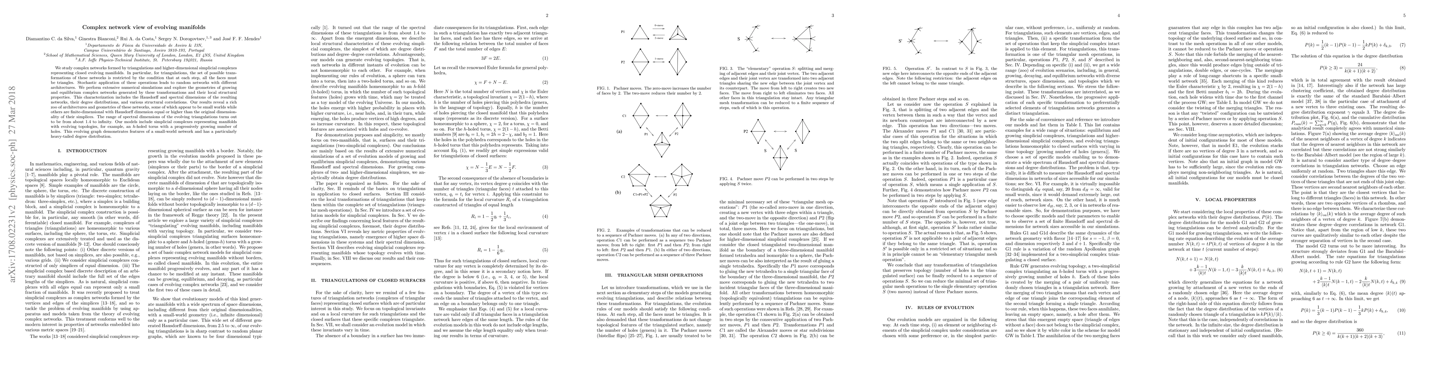 We study complex networks formed by triangulations and higher-dimensional simplicial complexes representing closed evolving manifolds. In particular, for triangulations, the set of possible transformations of these networks is restricted by the condition that at each step, all the faces must be triangles. Stochastic application of these operations leads to random networks with different architectures. We perform extensive numerical simulations and explore the geometries of growing and equilibrium complex networks generated by these transformations and their local structural properties. This characterization includes the Hausdorff and spectral dimensions of the resulting networks, their degree distributions, and various structural correlations. Our results reveal a rich zoo of architectures and geometries of these networks, some of which appear to be small worlds while others are finite-dimensional with Hausdorff dimension equal or higher than the original dimensionality of their simplices. The range of spectral dimensions of the evolving triangulations turns out to be from about 1.4 to infinity. Our models include simplicial complexes representing manifolds with evolving topologies, for example, an h-holed torus with a progressively growing number of holes. This evolving graph demonstrates features of a small-world network and has a particularly heavy-tailed degree distribution.
