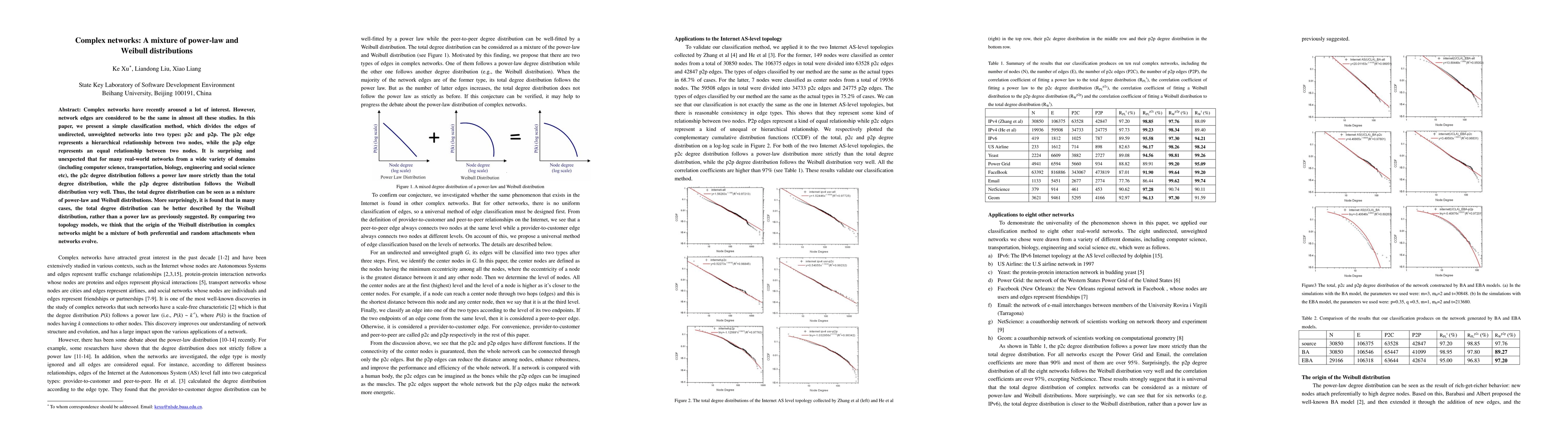 Complex networks have recently aroused a lot of interest. However, network edges are considered to be the same in almost all these studies. In this paper, we present a simple classification method, which divides the edges of undirected, unweighted networks into two types: p2c and p2p. The p2c edge represents a hierarchical relationship between two nodes, while the p2p edge represents an equal relationship between two nodes. It is surprising and unexpected that for many real-world networks from a wide variety of domains (including computer science, transportation, biology, engineering and social science etc), the p2c degree distribution follows a power law more strictly than the total degree distribution, while the p2p degree distribution follows the Weibull distribution very well. Thus, the total degree distribution can be seen as a mixture of power-law and Weibull distributions. More surprisingly, it is found that in many cases, the total degree distribution can be better described by the Weibull distribution, rather than a power law as previously suggested. By comparing two topology models, we think that the origin of the Weibull distribution in complex networks might be a mixture of both preferential and random attachments when networks evolve.