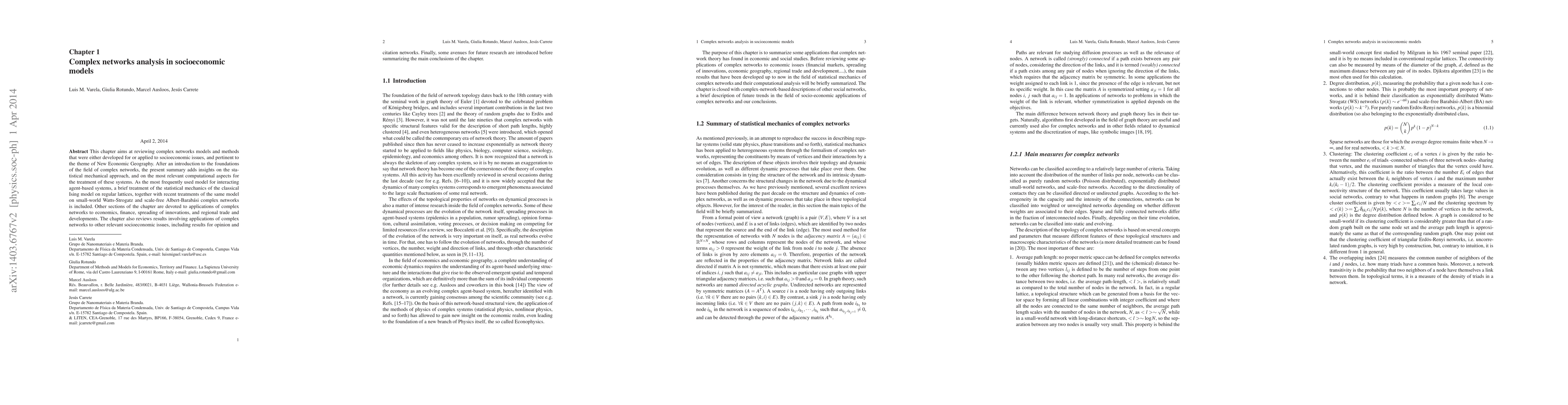 This chapter aims at reviewing complex networks models and methods that were either developed for or applied to socioeconomic issues, and pertinent to the theme of New Economic Geography. After an introduction to the foundations of the field of complex networks, the present summary adds insights on the statistical mechanical approach, and on the most relevant computational aspects for the treatment of these systems. As the most frequently used model for interacting agent-based systems, a brief description of the statistical mechanics of the classical Ising model on regular lattices, together with recent extensions of the same model on small-world Watts-Strogatz and scale-free Albert-Barabasi complex networks is included. Other sections of the chapter are devoted to applications of complex networks to economics, finance, spreading of innovations, and regional trade and developments. The chapter also reviews results involving applications of complex networks to other relevant socioeconomic issues, including results for opinion and citation networks. Finally, some avenues for future research are introduced before summarizing the main conclusions of the chapter.