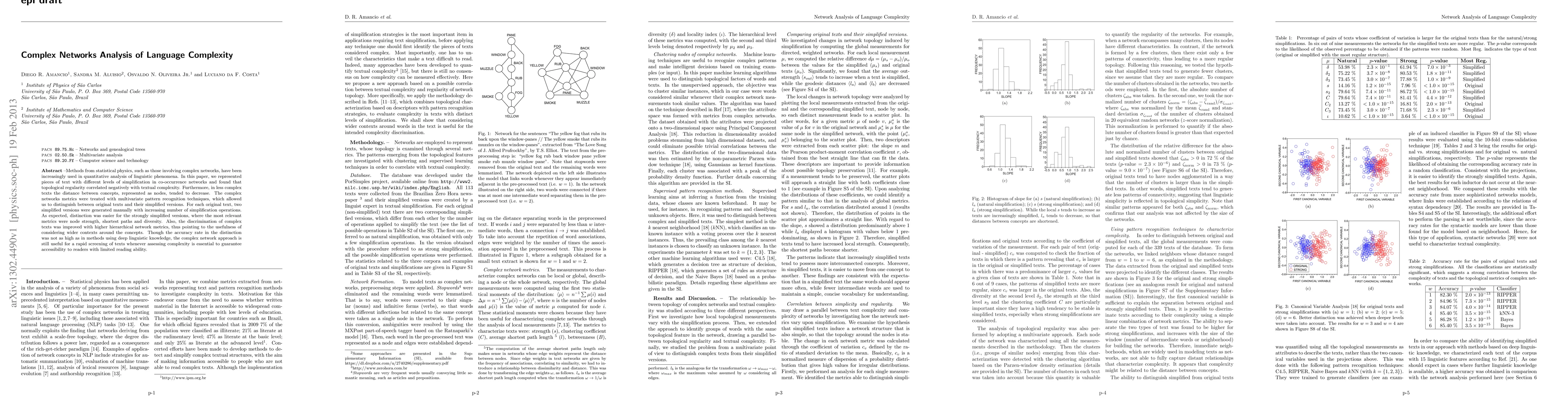 This paper uses complex networks analysis to measure language complexity by simplifying texts and comparing their characteristics with original texts. It finds that simplified texts show decreased distance between concepts and easier discrimination using network metrics.