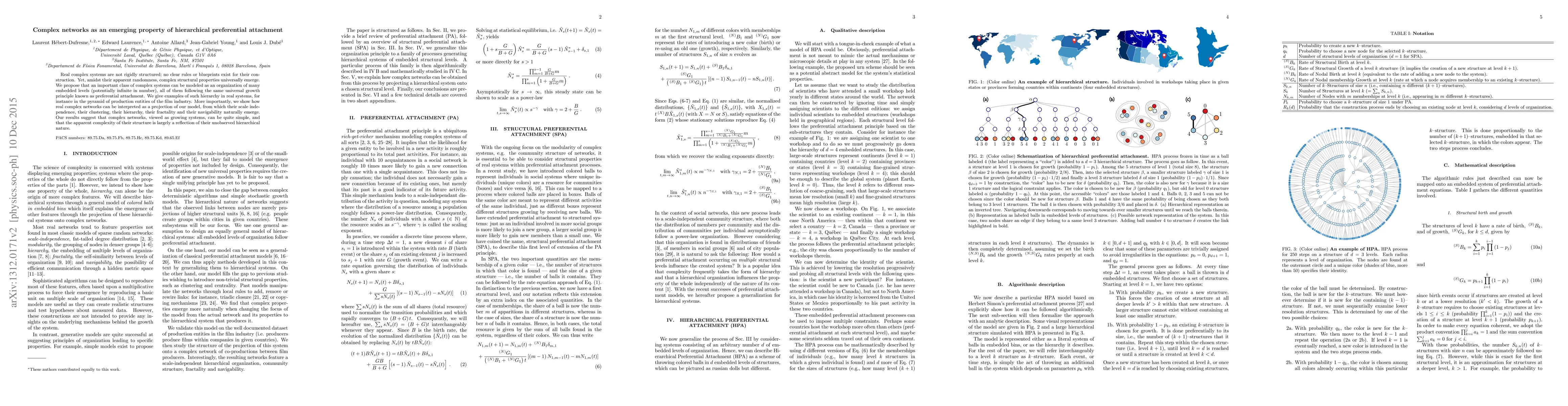 Complex networks emerge from hierarchical preferential attachment, where systems with infinite levels follow a simple growth principle, leading to scale independence, clustering, hierarchy, fractality, and navigability.