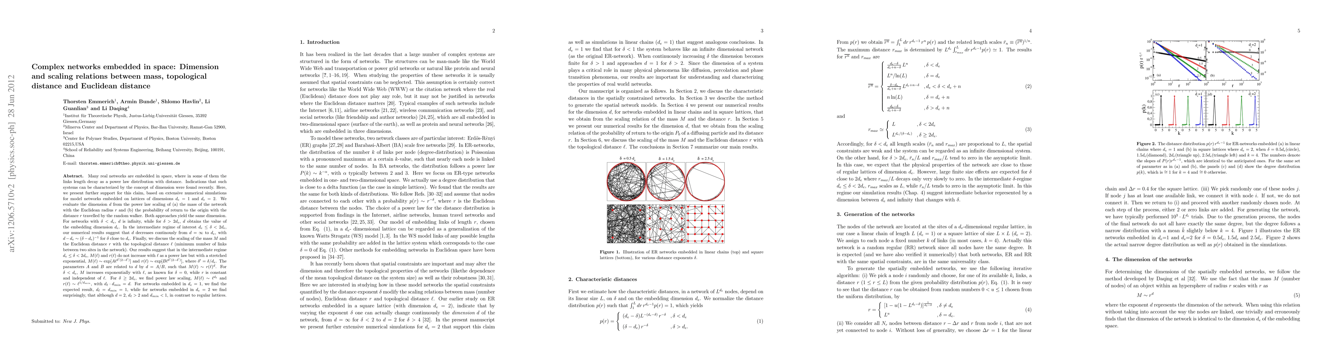 Many real networks are embedded in space, where in some of them the links length decay as a power law distribution with distance. Indications that such systems can be characterized by the concept of dimension were found recently. Here, we present further support for this claim, based on extensive numerical simulations for model networks embedded on lattices of dimensions $d_e=1$ and $d_e=2$. We evaluate the dimension $d$ from the power law scaling of (a) the mass of the network with the Euclidean radius $r$ and (b) the probability of return to the origin with the distance $r$ travelled by the random walker. Both approaches yield the same dimension. For networks with $\delta < d_e$, $d$ is infinity, while for $\delta > 2d_e$, $d$ obtains the value of the embedding dimension $d_e$. In the intermediate regime of interest $d_e \leq \delta < 2 d_e$, our numerical results suggest that $d$ decreases continously from $d = \infty$ to $d_e$, with $d - d_e \sim (\delta - d_e)^{-1}$ for $\delta$ close to $d_e$. Finally, we discuss the scaling of the mass $M$ and the Euclidean distance $r$ with the topological distance $\ell$. Our results suggest that in the intermediate regime $d_e \leq \delta < 2 d_e$, $M(\ell)$ and $r(\ell)$ do not increase with $\ell$ as a power law but with a stretched exponential, $M(\ell) \sim \exp [A \ell^{\delta' (2 - \delta')}]$ and $r(\ell) \sim \exp [B \ell^{\delta' (2 - \delta')}]$, where $\delta' = \delta/d_e$. The parameters $A$ and $B$ are related to $d$ by $d = A/B$, such that $M(\ell) \sim r(\ell)^d$. For $\delta < d_e$, $M$ increases exponentially with $\ell$, as known for $\delta=0$, while $r$ is constant and independent of $\ell$. For $\delta \geq 2d_e$, we find power law scaling, $M(\ell) \sim \ell^{d_\ell}$ and $r(\ell) \sim \ell^{1/d_{min}}$, with $d_\ell \cdot d_{min} = d$.