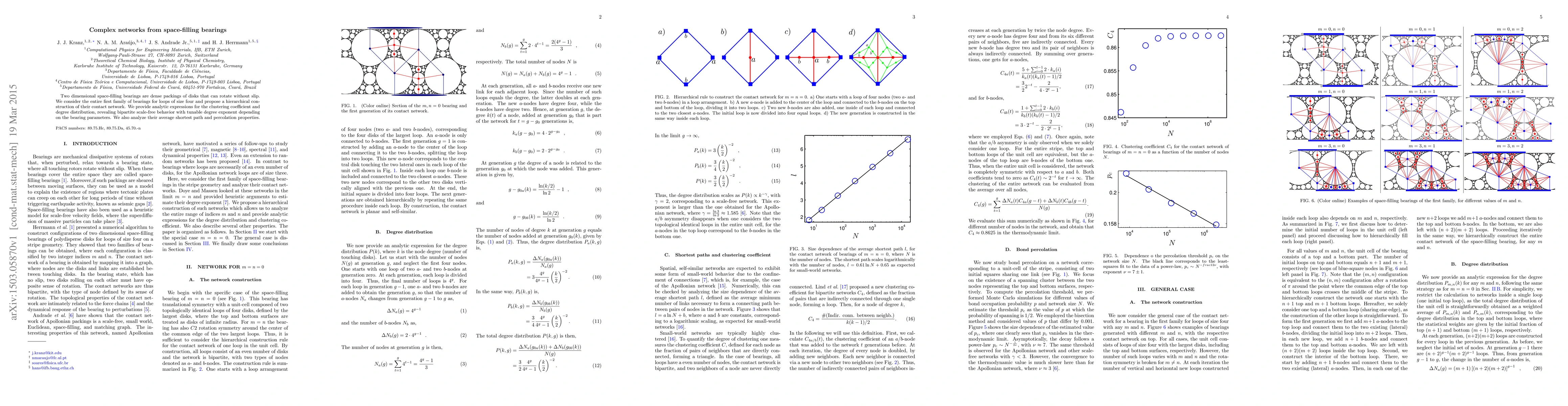 This paper studies complex networks formed by space-filling bearings, revealing bipartite scale-free behavior with tunable degree exponent, and analyzes their clustering coefficient, degree distribution, average shortest path, and percolation properties.