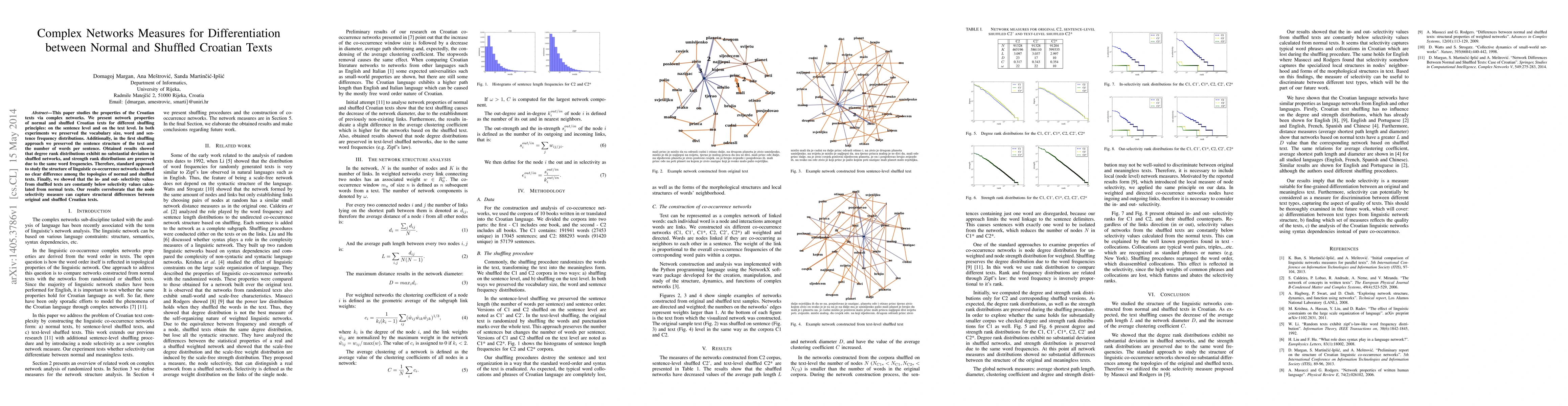 This paper studies the properties of the Croatian texts via complex networks. We present network properties of normal and shuffled Croatian texts for different shuffling principles: on the sentence level and on the text level. In both experiments we preserved the vocabulary size, word and sentence frequency distributions. Additionally, in the first shuffling approach we preserved the sentence structure of the text and the number of words per sentence. Obtained results showed that degree rank distributions exhibit no substantial deviation in shuffled networks, and strength rank distributions are preserved due to the same word frequencies. Therefore, standard approach to study the structure of linguistic co-occurrence networks showed no clear difference among the topologies of normal and shuffled texts. Finally, we showed that the in- and out- selectivity values from shuffled texts are constantly below selectivity values calculated from normal texts. Our results corroborate that the node selectivity measure can capture structural differences between original and shuffled Croatian texts.