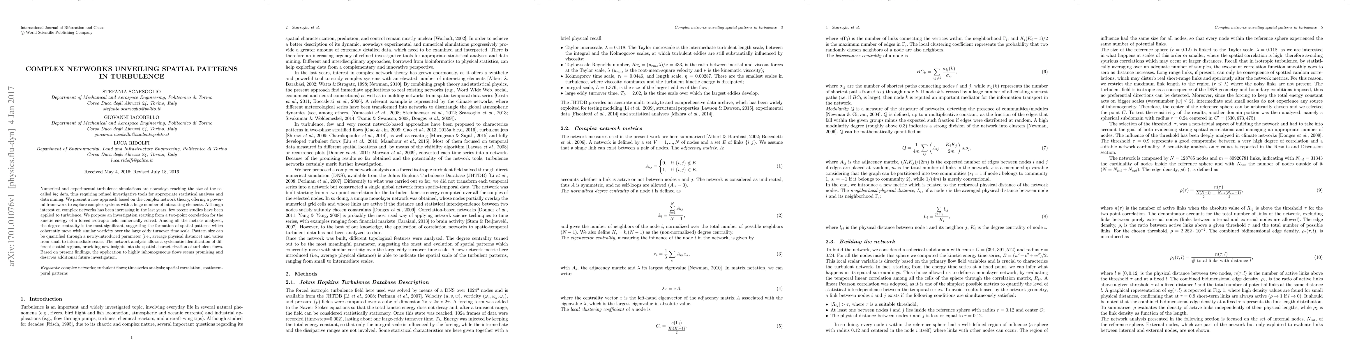 This research introduces a complex network theory approach to analyze large-scale turbulence data, finding that degree centrality reveals spatial patterns coherently moving with similar vorticity. A new parameter, average physical distance, quantifies pattern size, offering insights into turbulent flow characterization and potential future applications to inhomogeneous flows.