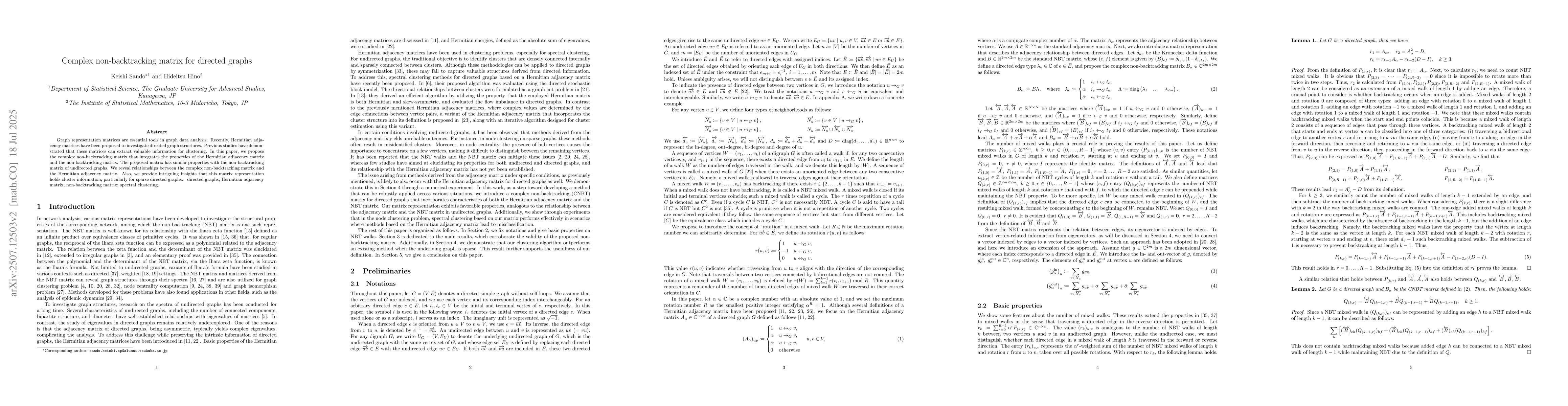 Graph representation matrices are essential tools in graph data analysis. Recently, Hermitian adjacency matrices have been proposed to investigate directed graph structures. Previous studies have demonstrated that these matrices can extract valuable information for clustering. In this paper, we propose the complex non-backtracking matrix that integrates the properties of the Hermitian adjacency matrix and the non-backtracking matrix. The proposed matrix has similar properties with the non-backtracking matrix of undirected graphs. We reveal relationships between the complex non-backtracking matrix and the Hermitian adjacency matrix. Also, we provide intriguing insights that this matrix representation holds cluster information, particularly for sparse directed graphs.