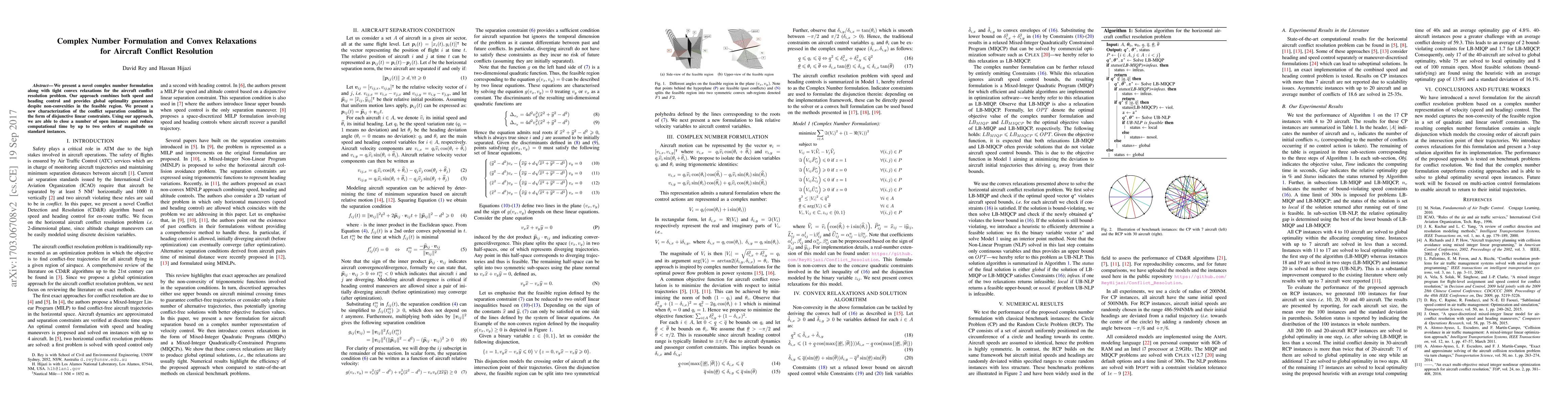 This paper introduces a novel complex number formulation and convex relaxations for resolving aircraft conflicts, ensuring global optimality and reducing computational time by up to two orders of magnitude. The approach features binary variables and quadratic concave constraints without trigonometric functions.