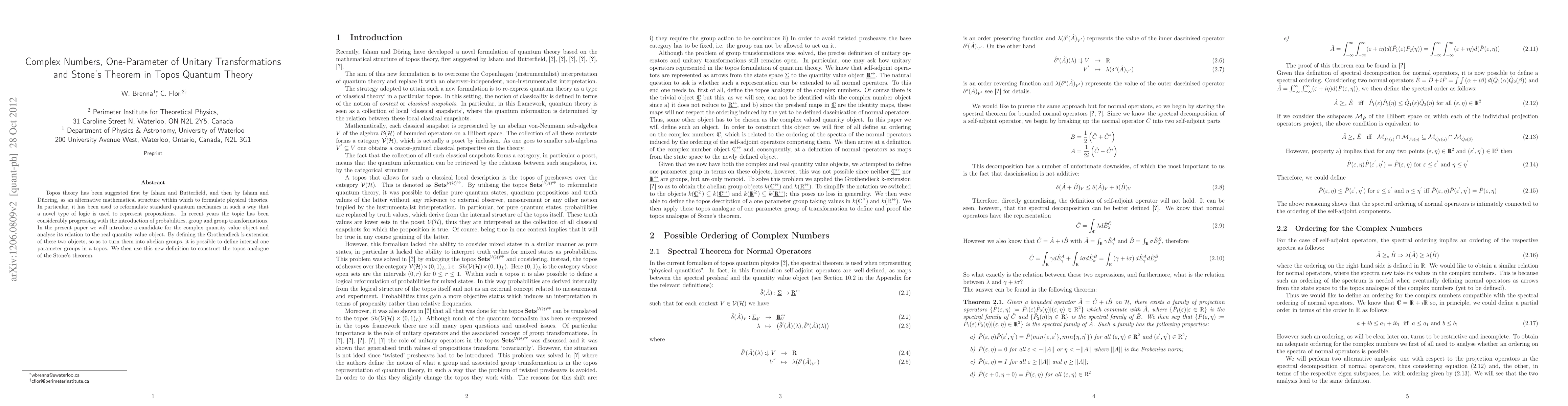 Topos theory has been suggested first by Isham and Butterfield, and then by Isham and Doering, as an alternative mathematical structure within which to formulate physical theories. In particular, it has been used to reformulate standard quantum mechanics in such a way that a novel type of logic is used to represent propositions. In recent years the topic has been considerably progressing with the introduction of probabilities, group and group transformations. In the present paper we will introduce a candidate for the complex quantity value object and analyse its relation to the real quantity value object. By defining the Grothendieck k-extension of these two objects, so as to turn them into abelian groups, it is possible to define internal one parameter groups in a topos. We then use this new definition to construct the topos analogue of the Stone's theorem.