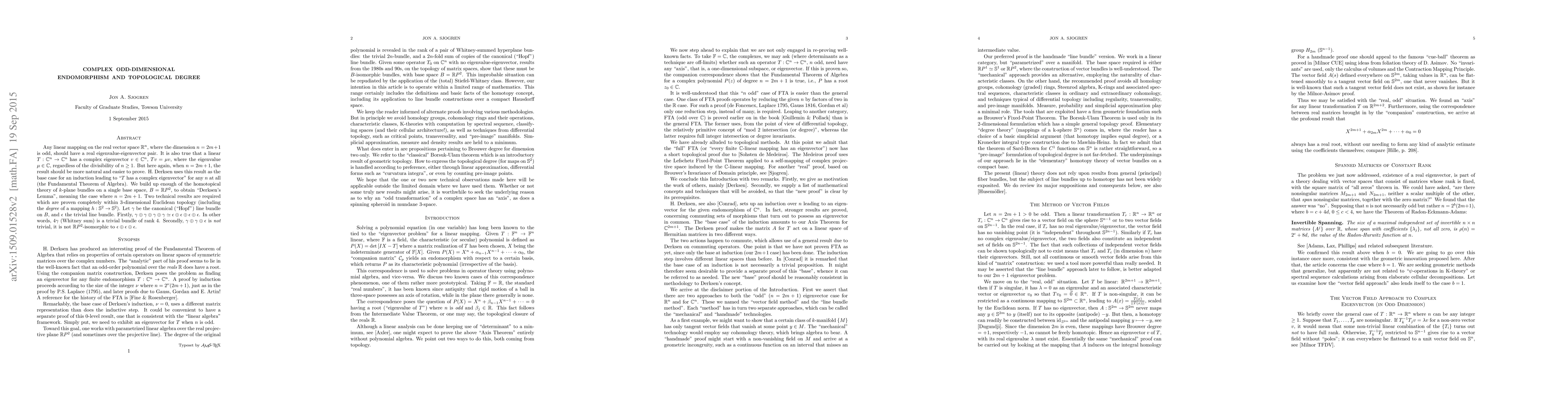 A linear mapping upon real n-dimensional space, where the dimension n is odd, has a real eigenvalue-eigenvector pair. The corresponding statement for complex vector spaces holds true for any dimension n, but should be easy to demonstrate when n is again odd. Derksen uses this result in an induction chain to prove the Fundamental Theorem of Algebra using matrix representations. In fact the question is closely tied to topological issues. We discuss proofs coming from vector field theory and characteristic classes. But a new proof uses rather elementary constructions. A complex linear n-mapping without an eigenvector gives rise to three real 2n-mappings, such that all transformations (mappings) in their (non-trivial) linear span have full rank (are linear isomorphisms). The theory of matrices of fixed rank shows that we obtain a 2n-plane bundle equation over the real projective plane. The equation states that the sum of trivial line bundles is essentially the same as the (same rank) sum of Hopf line bundles. To show that this yields a contradiction makes use of the homotopy theory of vector bundles over a base of low dimension, the two-dimensional Borsuk-Ulam theorem, and the invariance of topological degree for self-mappings of an (embedded) two-sphere in three-space.