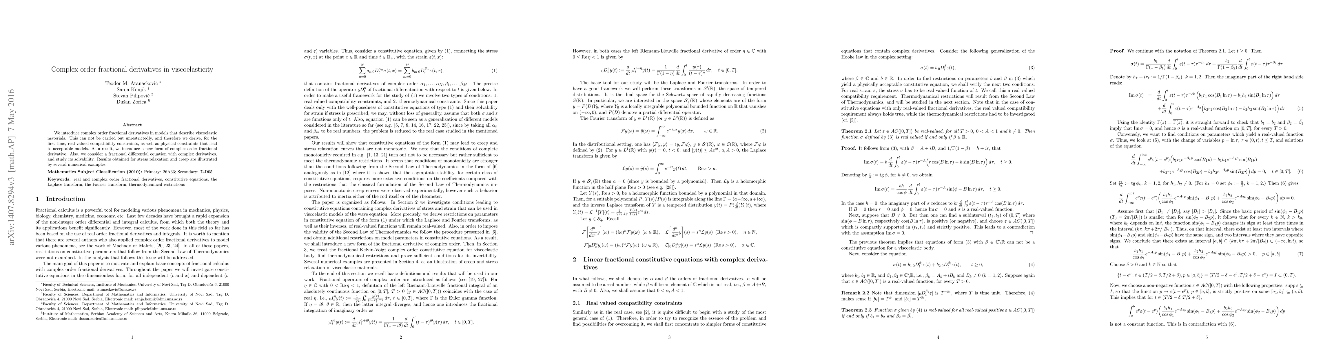 Researchers introduce complex order fractional derivatives in viscoelastic materials, deriving compatibility constraints for real-valued models and studying solvability of equations with these derivatives.