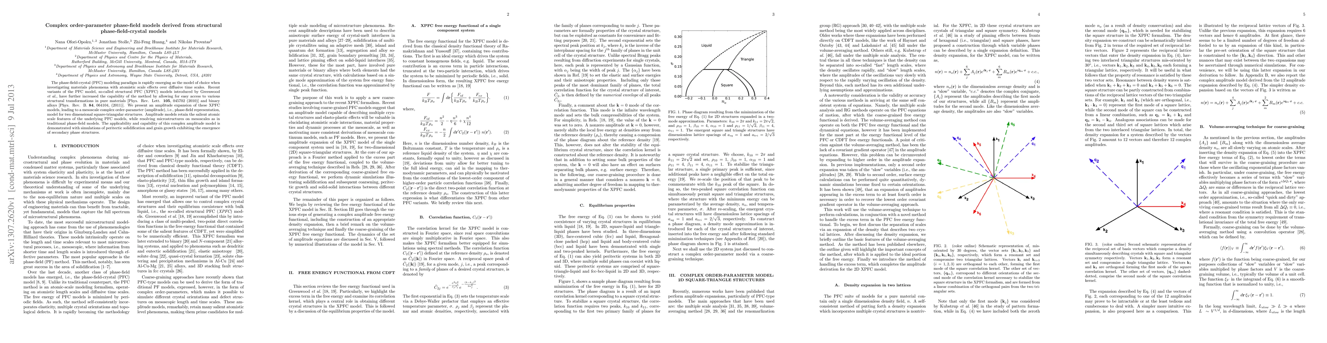 The phase-field-crystal (PFC) modeling paradigm is rapidly emerging as the model of choice when investigating materials phenomena with atomistic scale effects over diffusive time scales. Recent variants of the PFC model, so-called structural PFC (XPFC) models introduced by Greenwood et al., have further increased the capability of the method by allowing for easy access to various structural transformations in pure materials [Phys. Rev. Lett. 105, 045702 (2010)] and binary alloys [Phys. Rev. B. 84, 064104, (2011)]. We present an amplitude expansion of these XPFC models, leading to a mesoscale complex order-parameter (amplitude), i.e., phase-field representation, model for two dimensional square-triangular structures. Amplitude models retain the salient atomic scale features of the underlying PFC models, while resolving microstructures on mesoscales as in traditional phase-field models. The applicability and capability of this complex amplitude model is demonstrated with simulations of peritectic solidification and grain growth exhibiting the emergence of secondary phase structures.