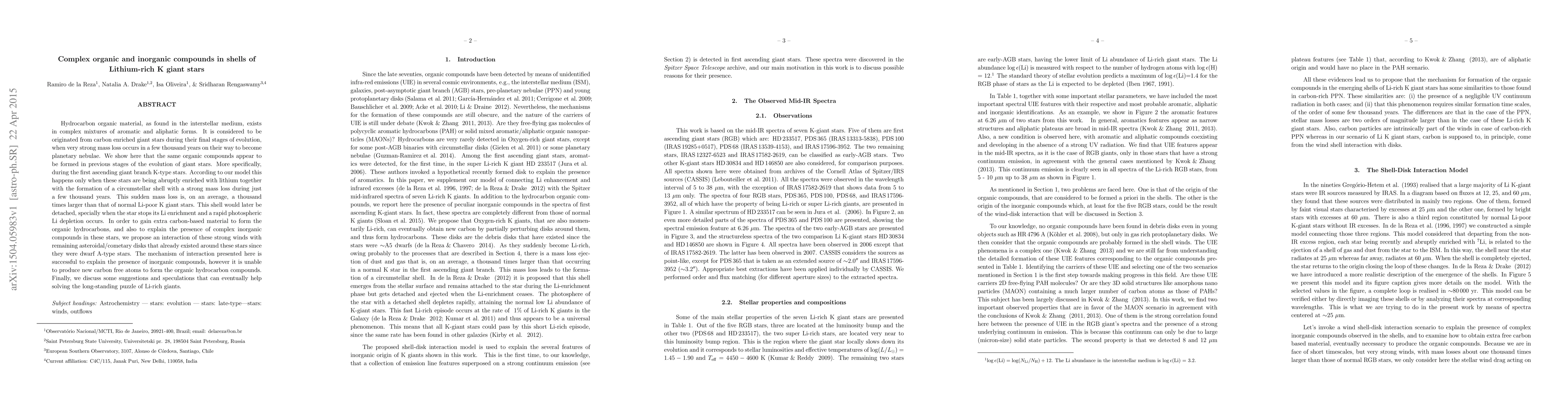 This paper investigates the formation of complex organic and inorganic compounds in the shells of lithium-rich K giant stars, proposing that these compounds originate from interactions between strong stellar winds and pre-existing asteroidal/cometary disks. The study suggests that these stars experience significant mass loss and lithium enrichment during their evolution, leading to the formation of these compounds.