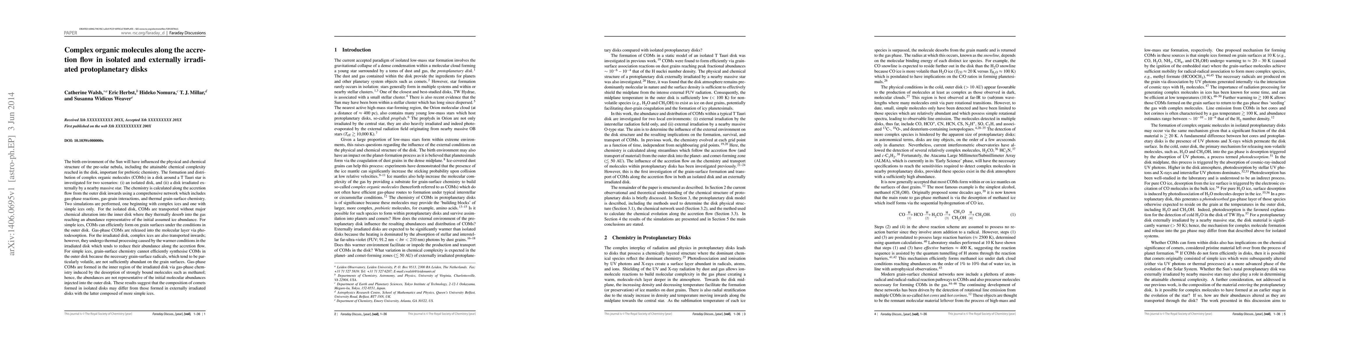 This study investigates the formation and distribution of complex organic molecules in protoplanetary disks under isolated and externally irradiated conditions. In isolated disks, complex organic molecules are transported into the inner disk and desorb into the gas phase, while in irradiated disks, they undergo thermal processing, leading to different chemical compositions between the two scenarios.