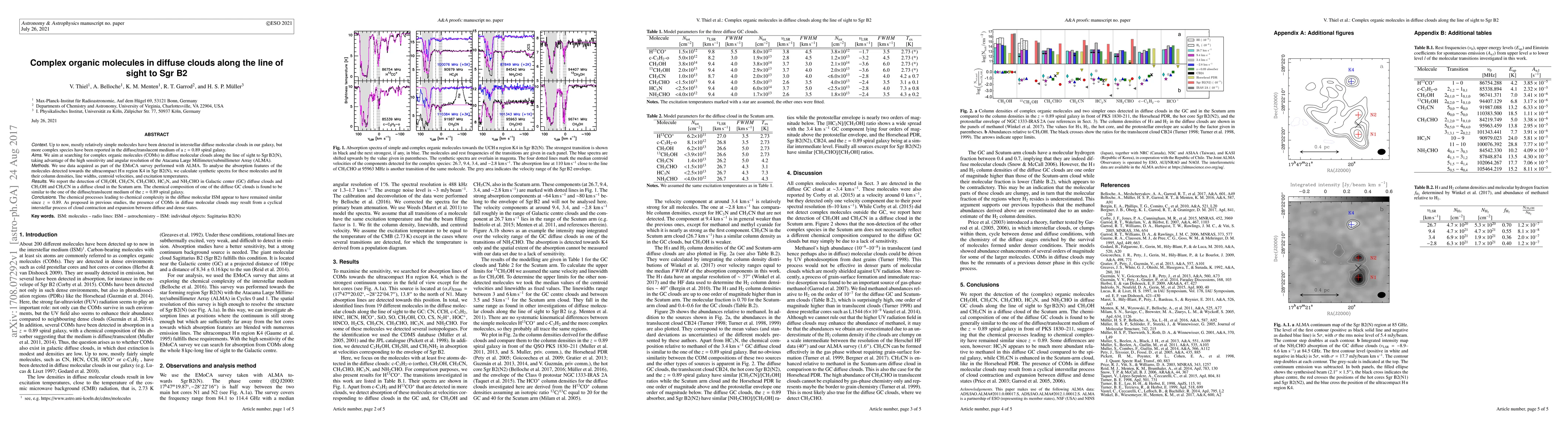 This study detects complex organic molecules (COMs) such as CH3OH, CH3CN, and HC3N in diffuse molecular clouds along the line of sight to Sgr B2 using ALMA data. The findings suggest that the chemical complexity in these clouds is similar to that observed in a distant spiral galaxy, indicating consistent chemical processes over cosmic time.