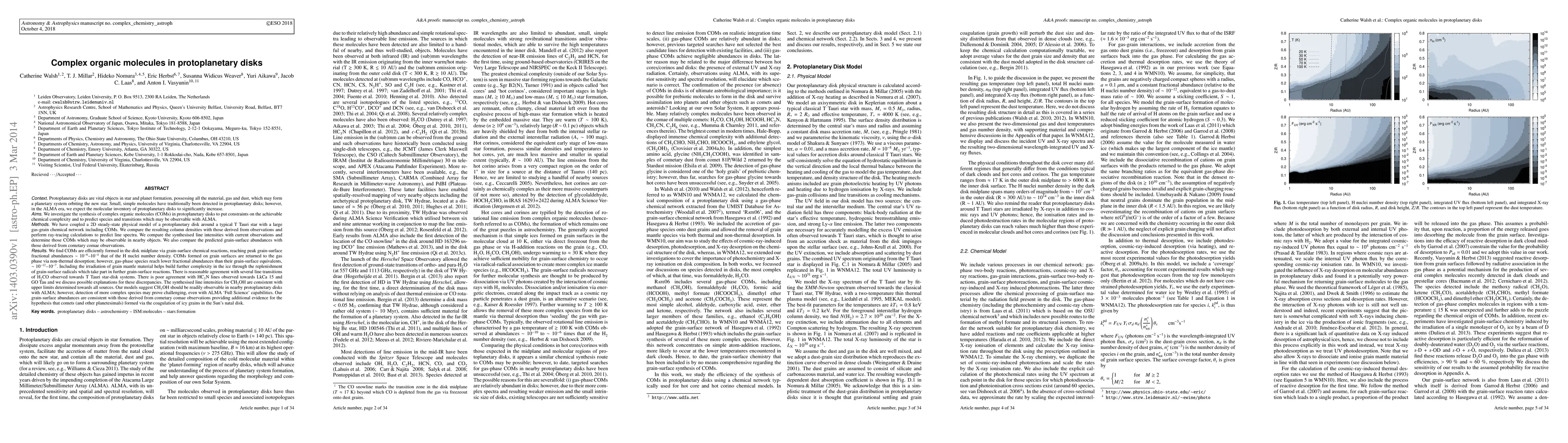 This paper investigates the formation of complex organic molecules (COMs) in protoplanetary disks using a 2D model and gas-grain chemical network. COMs are efficiently formed on grain surfaces, with methanol (CH3OH) predicted to be observable with ALMA, while more complex species may be challenging to detect.