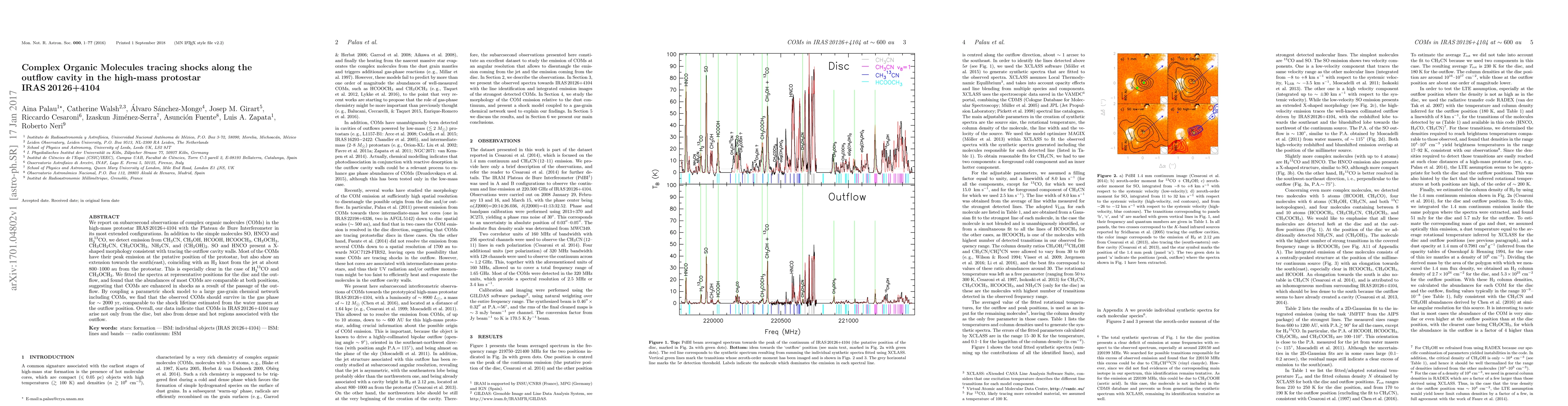 This study uses high-resolution observations to detect complex organic molecules in the high-mass protostar IRAS20126+4104, finding that most molecules peak near the protostar but also extend towards the outflow cavity. The data suggest that these molecules are enhanced in shocks from the outflow, with their survival in the gas phase aligning with the shock lifetime.