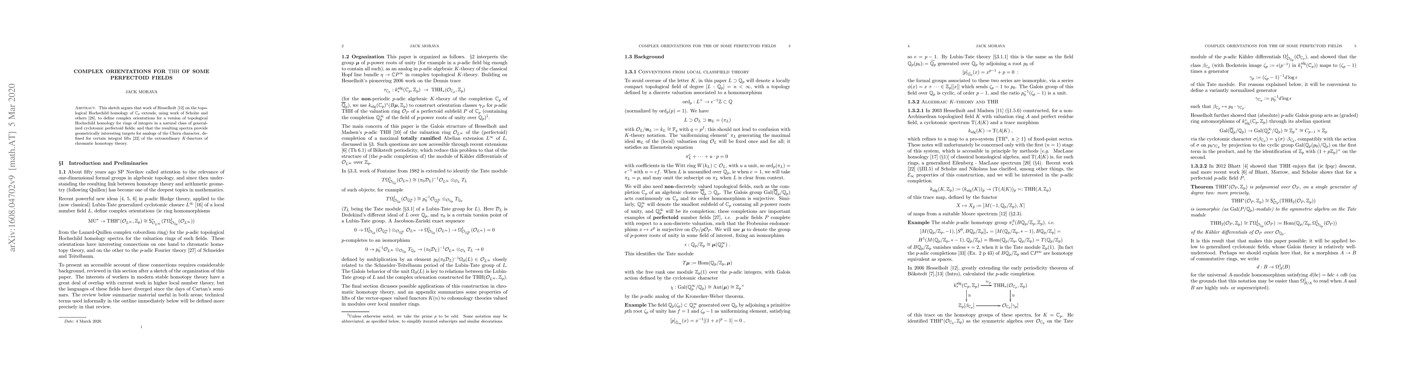 This sketch argues that work of Hesselholt on the topological Hochschild homology of $\Cp$ extends, using work of Scholze and others, to define complex orientations for a version of topological Hochschild homology for rings of integers in a natural class of generalized cyclotomic perfectoid fields; and that the resulting spectra provide geometrically interesting targets for analogs of the Chern character, defined for certain integral lifts of the extraordinary $K$-functors of chromatic homotopy theory.