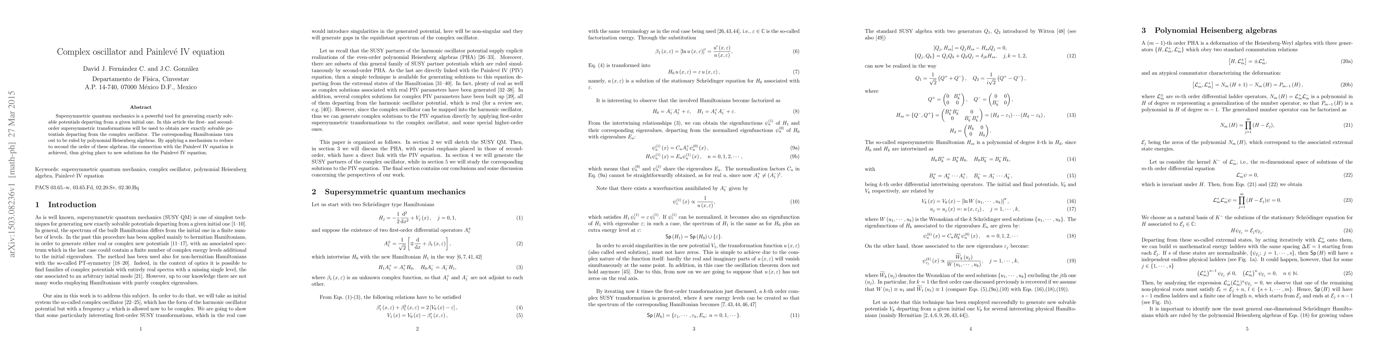 This paper utilizes supersymmetric quantum mechanics to derive new exactly solvable potentials from the complex oscillator, revealing their connection to polynomial Heisenberg algebras. The study connects these transformations to the Painlevé IV equation, providing new solutions.