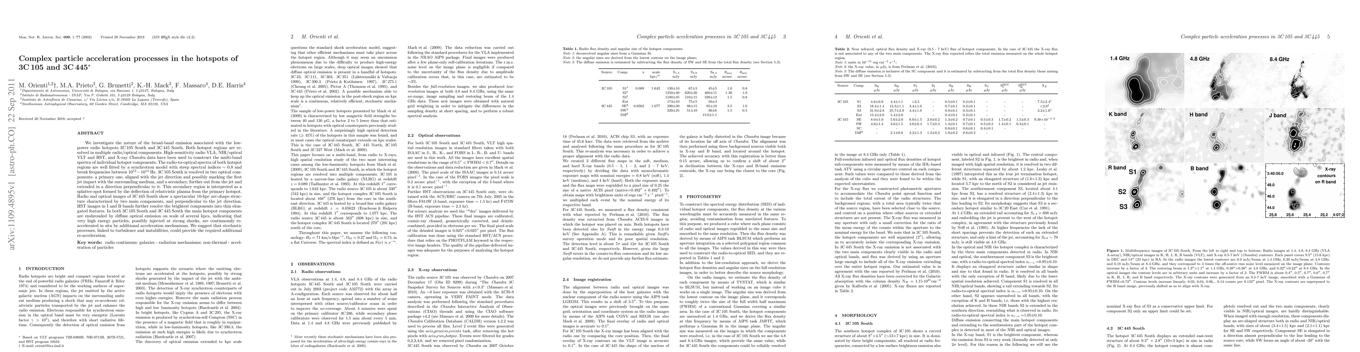 The study examines the complex particle acceleration in the hotspots of 3C105 and 3C445, finding steep synchrotron spectral indices and break frequencies. Both hotspots, resolved into multiple components, display diffuse optical emission suggesting continuous re-acceleration of high-energy particles via additional mechanisms like turbulence and instabilities.