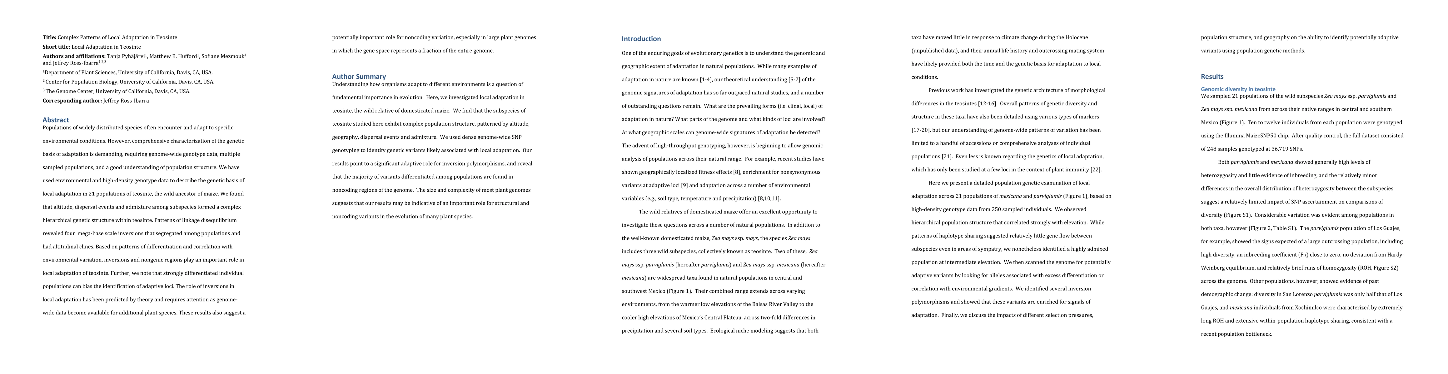 Populations of widely distributed species often encounter and adapt to specific environmental conditions. However, comprehensive characterization of the genetic basis of adaptation is demanding, requiring genome-wide genotype data, multiple sampled populations, and a good understanding of population structure. We have used environmental and high-density genotype data to describe the genetic basis of local adaptation in 21 populations of teosinte, the wild ancestor of maize. We found that altitude, dispersal events and admixture among subspecies formed a complex hierarchical genetic structure within teosinte. Patterns of linkage disequilibrium revealed four mega-base scale inversions that segregated among populations and had altitudinal clines. Based on patterns of differentiation and correlation with environmental variation, inversions and nongenic regions play an important role in local adaptation of teosinte. Further, we note that strongly differentiated individual populations can bias the identification of adaptive loci. The role of inversions in local adaptation has been predicted by theory and requires attention as genome-wide data become available for additional plant species. These results also suggest a potentially important role for noncoding variation, especially in large plant genomes in which the gene space represents a fraction of the entire genome.
