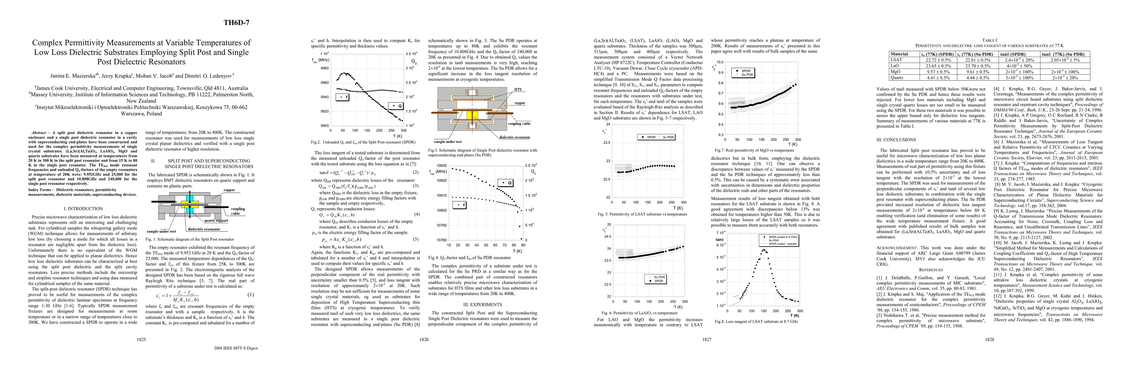 This paper details the use of split post and single post dielectric resonators to measure the complex permittivity of low-loss dielectric substrates like (La,Sr)(Al,Ta)O3, LaAlO3, MgO, and quartz at varying temperatures. The measurements were conducted from 20 K to 300 K for the split post resonator and from 15 K to 80 K for the single post resonator.