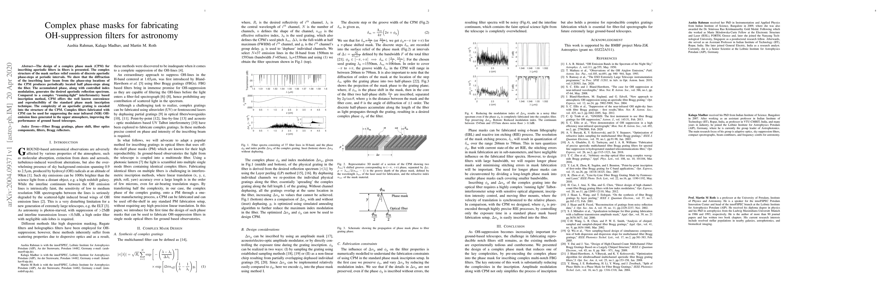 The design of a complex phase mask (CPM) for inscribing aperiodic filters in fibers is presented. The complex structure of the mask surface relief consists of discrete aperiodic phase-steps at periodic intervals. We show that the diffraction of the inscribing laser beam from the phase-step locations of the CPM produces periodically located half phase-steps along the fiber. The accumulated phase, along with controlled index modulation, generates the desired aperiodic reflection spectrum. Compared to a complex 'running-light' interferometry based inscription method, CPM offers the well known convenience and reproducibility of the standard phase mask inscription technique. The complexity of an aperiodic grating is encoded into the structure of the CPM. Complex filters fabricated with CPM can be used for suppressing the near infrared (NIR) OH- emission lines generated in the upper atmosphere, improving the performance of ground based telescopes.