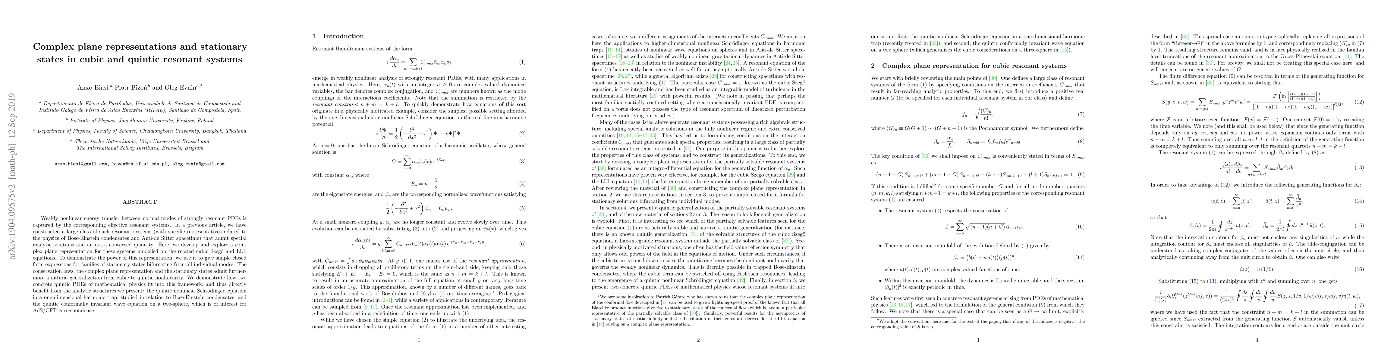 Weakly nonlinear energy transfer between normal modes of strongly resonant PDEs is captured by the corresponding effective resonant systems. In a previous article, we have constructed a large class of such resonant systems (with specific representatives related to the physics of Bose-Einstein condensates and Anti-de Sitter spacetime) that admit special analytic solutions and an extra conserved quantity. Here, we develop and explore a complex plane representation for these systems modelled on the related cubic Szego and LLL equations. To demonstrate the power of this representation, we use it to give simple closed form expressions for families of stationary states bifurcating from all individual modes. The conservation laws, the complex plane representation and the stationary states admit furthermore a natural generalization from cubic to quintic nonlinearity. We demonstrate how two concrete quintic PDEs of mathematical physics fit into this framework, and thus directly benefit from the analytic structures we present: the quintic nonlinear Schroedinger equation in a one-dimensional harmonic trap, studied in relation to Bose-Einstein condensates, and the quintic conformally invariant wave equation on a two-sphere, which is of interest for AdS/CFT-correspondence.