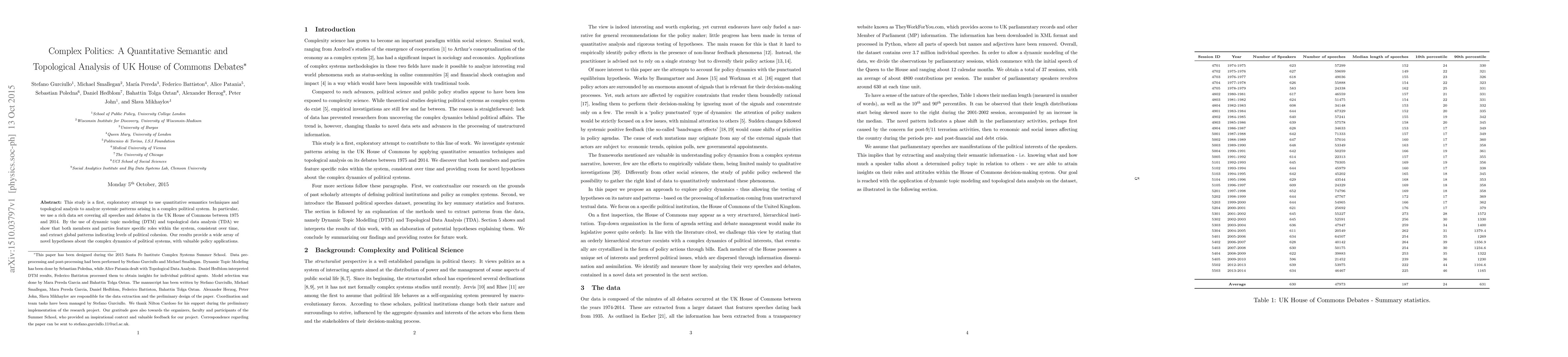 This study is a first, exploratory attempt to use quantitative semantics techniques and topological analysis to analyze systemic patterns arising in a complex political system. In particular, we use a rich data set covering all speeches and debates in the UK House of Commons between 1975 and 2014. By the use of dynamic topic modeling (DTM) and topological data analysis (TDA) we show that both members and parties feature specific roles within the system, consistent over time, and extract global patterns indicating levels of political cohesion. Our results provide a wide array of novel hypotheses about the complex dynamics of political systems, with valuable policy applications.