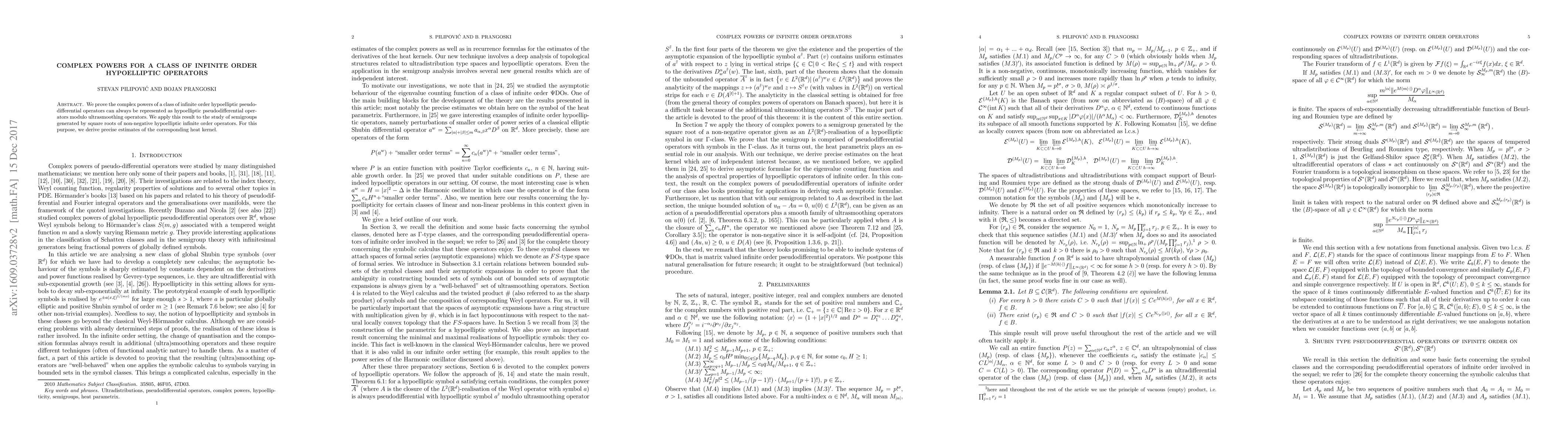 This paper proves that complex powers of a class of infinite order hypoelliptic pseudodifferential operators can be represented as hypoelliptic pseudodifferential operators, and applies this result to study semigroups generated by square roots of non-negative hypoelliptic operators, deriving precise estimates for the corresponding heat kernel.
