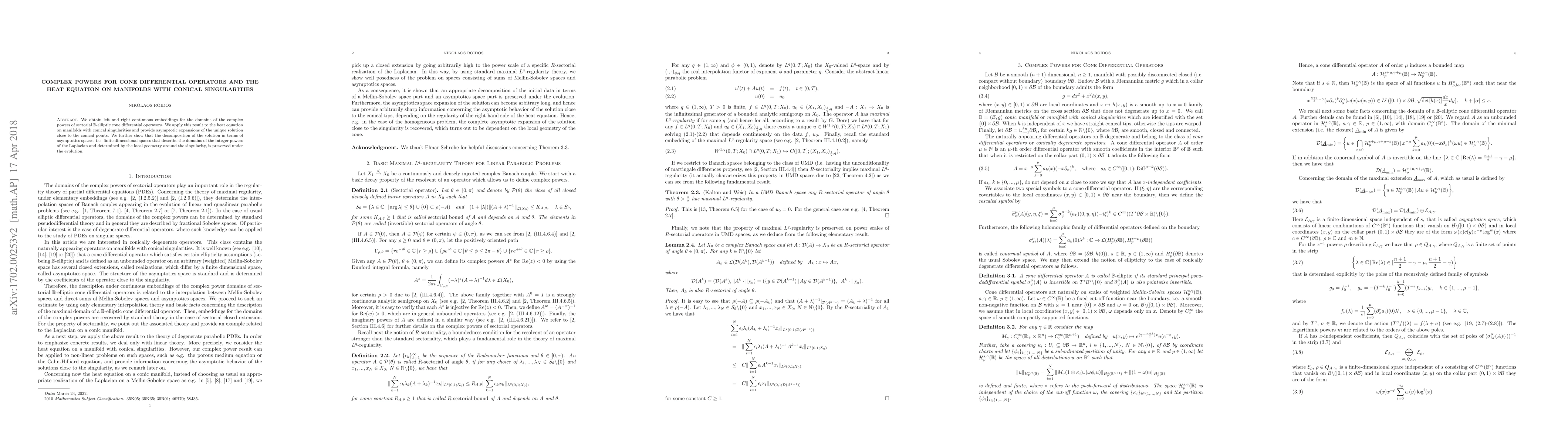 This paper establishes continuous embeddings for complex powers of cone differential operators and applies these results to the heat equation on manifolds with conical singularities, providing asymptotic expansions near singularities and demonstrating the preservation of solution decompositions under evolution.