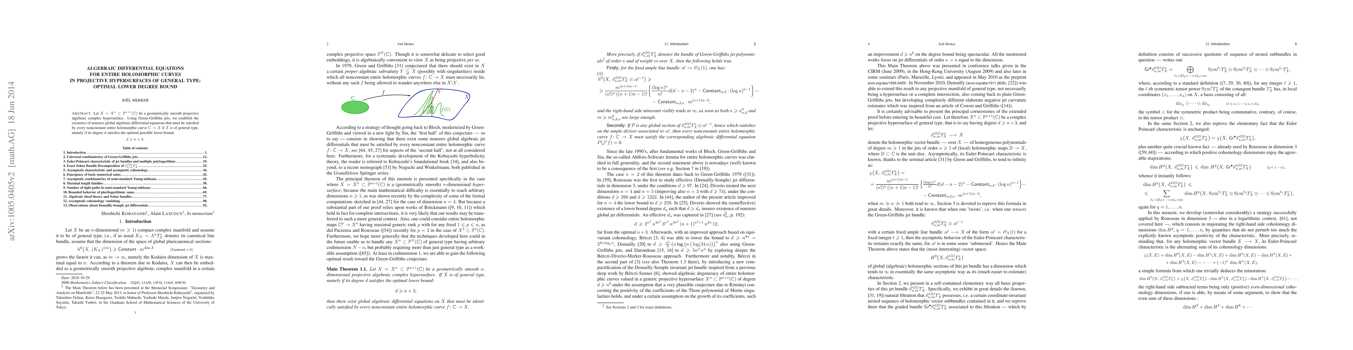 Let X be a geometrically smooth n-dimensional projective algebraic complex hypersurface in P^{n+1}(C). Using Green-Griffiths jets, we establish the existence of nonzero global algebraic differential equations that must be satisfied by every nonconstant entire holomorphic curve C -> X if X is of general type, namely if its degree d satisfies the optimal possible lower bound: d >= n + 3. The case n = 2 dates back to Green-Griffiths 1979, while according to very recent advances (Invent. Math. 180, pp. 161-223, February 2010), the best (and only) lower degree bound known previously in arbitrary dimension n was, using instead Demailly-Semple jets, something like d >= 2^{n^4} . n^{5n^3}, which, visibly, was far from the conjectured n + 3.