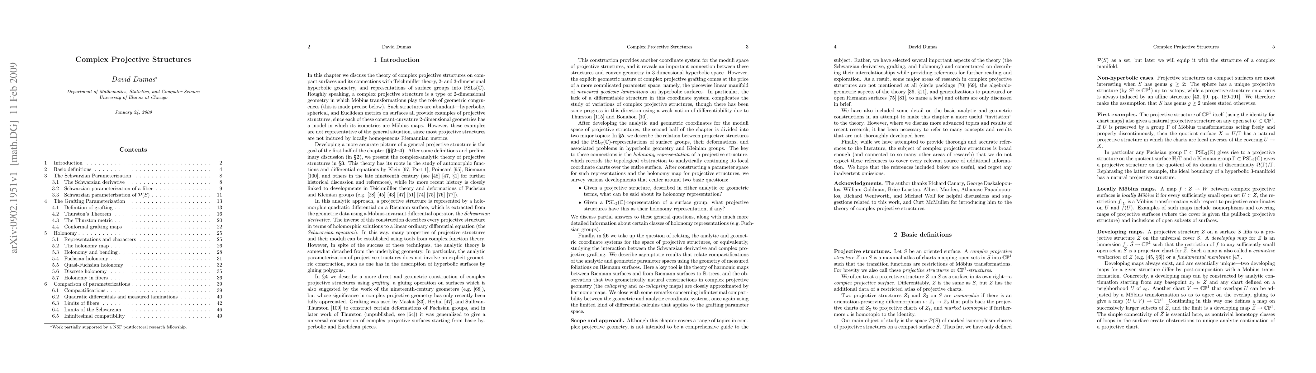 This paper surveys complex projective (CP^1) structures on compact surfaces, focusing on three main topics: using the Schwarzian derivative to parameterize the moduli space, Thurston's grafting method for parameterization, and holonomy representations of CP^1 structures, while comparing these parameterizations and their relation to the holonomy map.