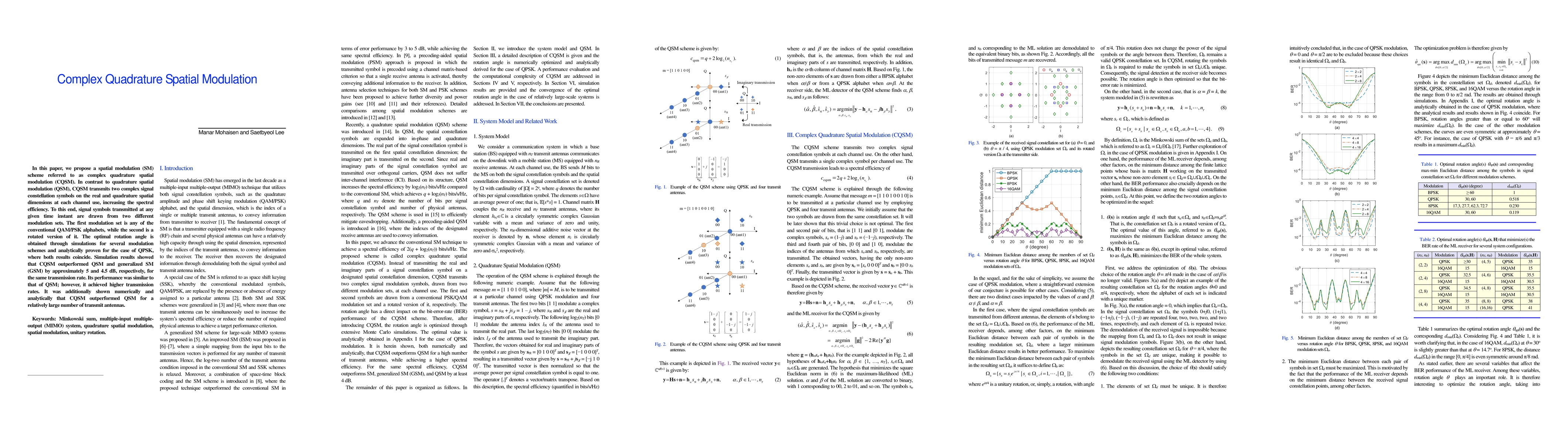 In this paper, we propose a spatial modulation (SM) scheme referred to as complex quadrature spatial modulation (CQSM). In contrast to quadrature spatial modulation (QSM), CQSM transmits two complex signal constellation symbols on the real and quadrature spatial dimensions at each channel use, increasing the spectral efficiency. To this end, signal symbols transmitted at any given time instant are drawn from two different modulation sets. The first modulation set is any of the conventional QAM/PSK alphabets, while the second is a rotated version of it. The optimal rotation angle is obtained through simulations for several modulation schemes and analytically proven for the case of QPSK, where both results coincide. Simulation results showed that CQSM outperformed QSM and generalized SM (GSM) by approximately 5 and 4.5 dB, respectively, for the same transmission rate. Its performance was similar to that of QSM; however, it achieved higher transmission rates. It was additionally shown numerically and analytically that CQSM outperformed QSM for a relatively large number of transmit antennas.