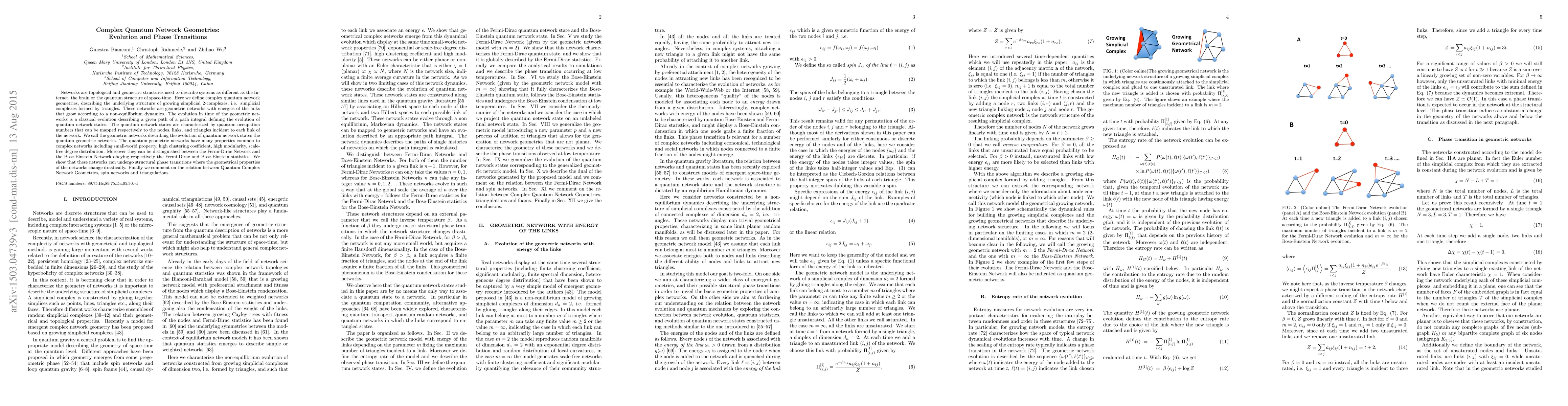 This paper explores complex quantum network geometries, defined as growing simplicial 2-complexes with evolving geometric networks characterized by quantum occupation numbers. It identifies structural phase transitions in these networks, distinguishing between Fermi-Dirac and Bose-Einstein networks, and discusses their relation to spin networks and triangulations.