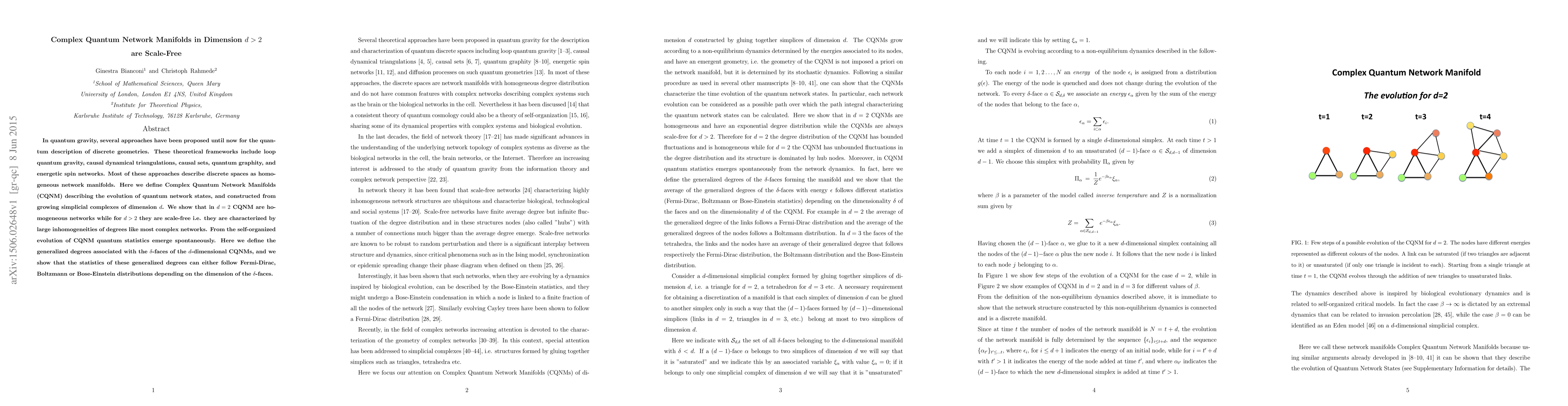 In quantum gravity, several approaches have been proposed until now for the quantum description of discrete geometries. These theoretical frameworks include loop quantum gravity, causal dynamical triangulations, causal sets, quantum graphity, and energetic spin networks. Most of these approaches describe discrete spaces as homogeneous network manifolds. Here we define Complex Quantum Network Manifolds (CQNM) describing the evolution of quantum network states, and constructed from growing simplicial complexes of dimension $d$. We show that in $d=2$ CQNM are homogeneous networks while for $d>2$ they are scale-free i.e. they are characterized by large inhomogeneities of degrees like most complex networks. From the self-organized evolution of CQNM quantum statistics emerge spontaneously. Here we define the generalized degrees associated with the $\delta$-faces of the $d$-dimensional CQNMs, and we show that the statistics of these generalized degrees can either follow Fermi-Dirac, Boltzmann or Bose-Einstein distributions depending on the dimension of the $\delta$-faces.